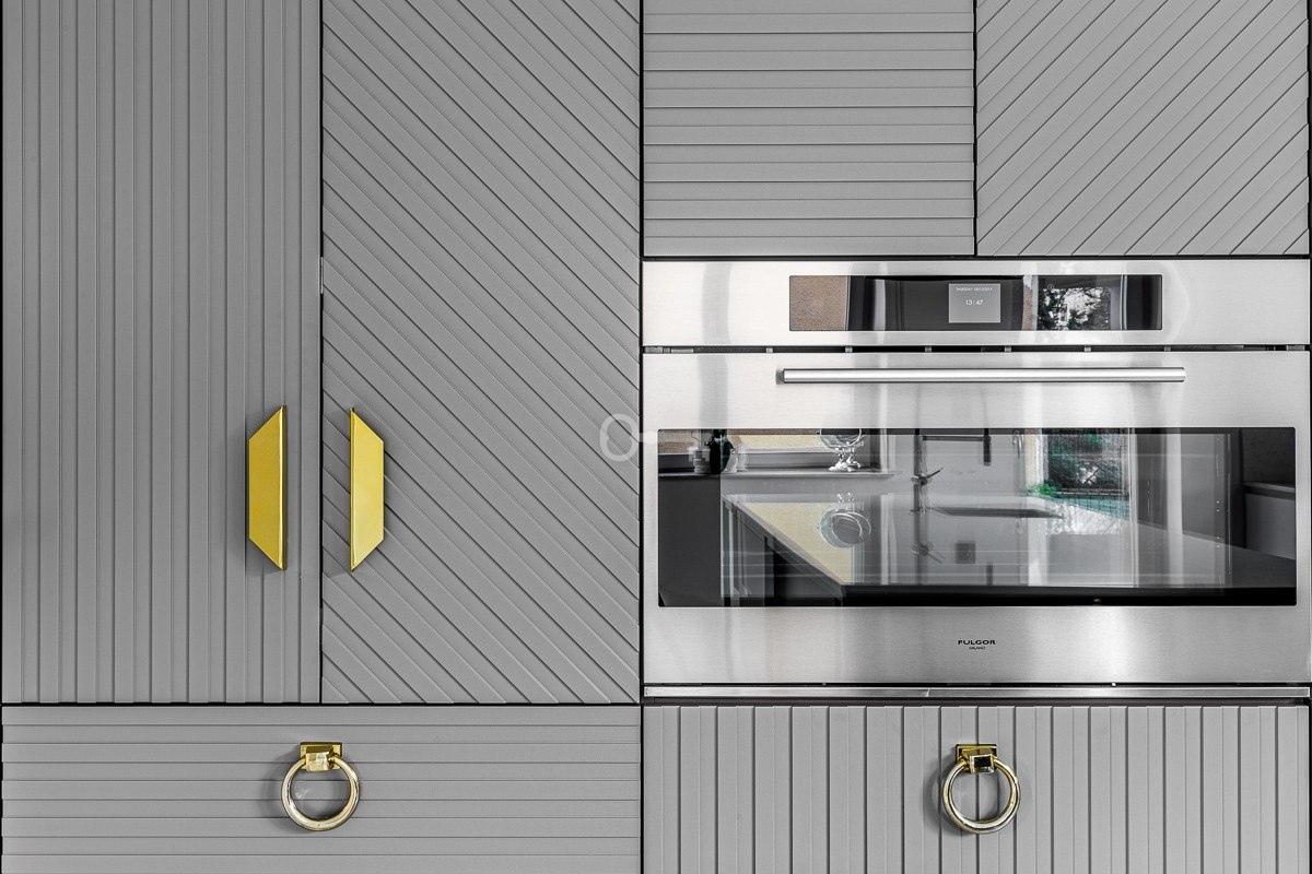 Nowoczesna zabudowa kuchni, z biżuteryjnymi dodatkami w kolorze złota, industrialne elementy wykończenia stropu oraz ściana z surowej cegły (ocalona z oryginalnego budynku) to tylko niektóre elementy podkreślające indywidualny charakter rezydencji.