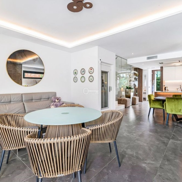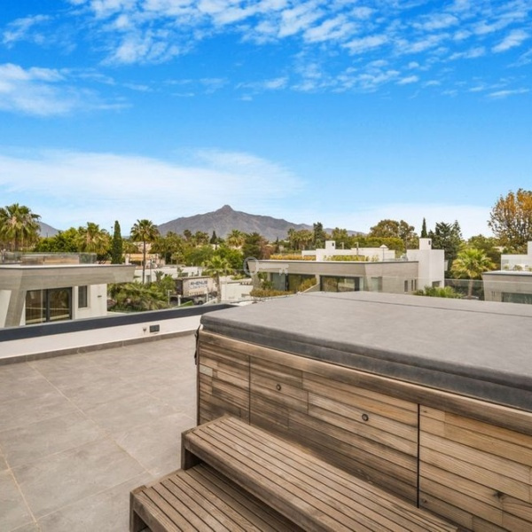 Spektakularna willa z czterema sypialniami w zabudowie bliźniaczej w Puerto Banus, zaledwie 300 m od plaży i wszystkich udogodnień. Ta oszałamiająca nieruchomość na poziomie wejściowym ma salon i jadalnię na otwartym planie, w pełni wyposażoną kuchnię na otwartym planie, toaletę dla gości oraz przesuwane drzwi prowadzące do prywatnego ogrodu i podgrzewanego basenu. Na pierwszym piętrze znajduje się główny apartament z garderobą i prywatnym tarasem oraz dwie sypialnie dla gości ze wspólną łazienką. Następny poziom prowadzi do dużego solarium z miejscem do grillowania, jacuzzi i pięknymi widokami na góry. Na niższym poziomie znajduje się sypialnia dla gości, łazienka dla gości, aneks kuchenny, salon i dostęp do podwójnego prywatnego garażu z miejscem na dwa samochody. Inne funkcje obejmują ciepłą i zimną klimatyzację, ogrzewanie podłogowe w całym budynku, system alarmowy i windę łączącą wszystkie poziomy.