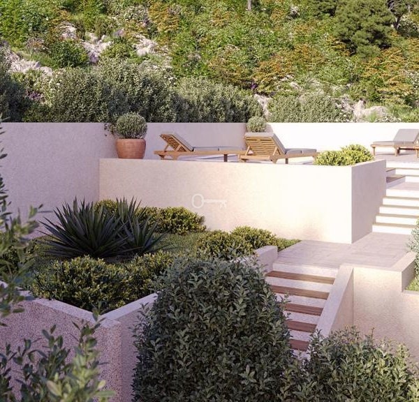 Ze względu na uksztaltowanie terenu ogród zaplanowano kaskadowo, a basen znajduje się na górnym tarasie z dostępem na taras dachowy.