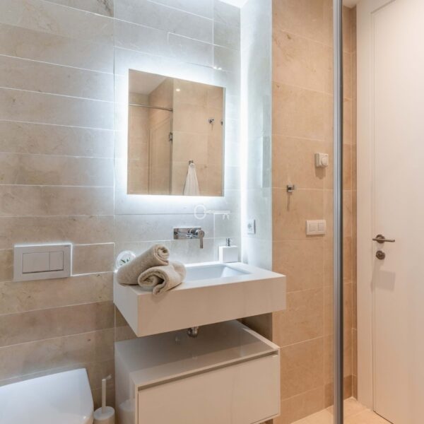 Nieruchomość jest rozmieszczona na 4 piętrach i obejmuje na głównym piętrze jasny i przestronny salon, nowoczesną kuchnię na otwartym planie z najwyższej klasy sprzętem AGD, oddzielne pomieszczenie gospodarcze i taras od strony południowo-zachodniej z widokiem na park z drzewami oliwnymi, który zapewnia spokój i prywatność.
