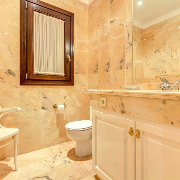 Niższy poziom ogrodu: kolejny przestronny salon z kominkiem i dostępem do ogrodu i strefy basenowej; przestronna, w pełni wyposażona i wyposażona druga kuchnia; pralnia z angielskim oknem tarasowym, może być przekształcona w siłownię lub salę kina domowego; 2 przestronne sypialnie z łazienkami, obie z dostępem do ogrodu i strefy basenowej; maszynownia z niezależnym dostępem pod zadaszoną wiatą samochodową z WC, zlewem i złożem wody. Willa posiada ogrzewanie podłogowe, drewniane (iroco) okna w całym domu, system Aerothermy, panele słoneczne.