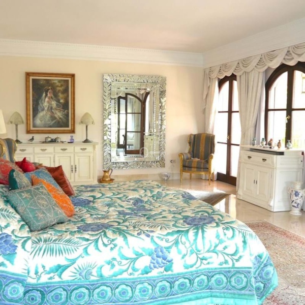 Na piętrze: główna sypialnia z kominkiem, aneksem kuchennym, garderobą i dostępem do dużego południowego tarasu z cudownym widokiem na otaczającą przyrodę, golf i częściowo morze; kolejna sypialnia z łazienką i 2 balkonami, obecnie używana jako gabinet.