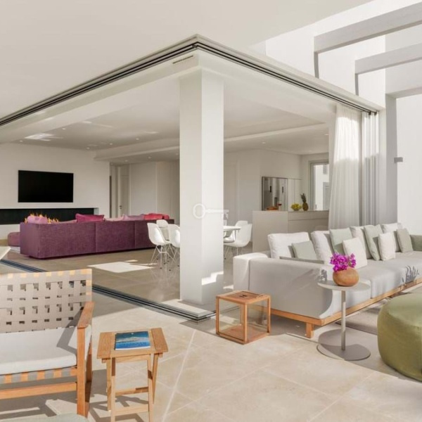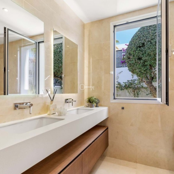 Pierwsze piętro służy jako wejście, z holem i przestronną otwartą kuchnią, salonem i jadalnią, która płynnie otwiera się na prywatny ogród i podgrzewany basen przez wysokie przesuwane drzwi. Okna o pełnej wysokości można schować w ścianach, łącząc wewnętrzną i zewnętrzną przestrzeń mieszkalną, pozwalając właścicielom cieszyć się wspaniałym klimatem Marbelli przez cały rok. Dodatkowo na pierwszym piętrze znajduje się główna sypialnia z łazienką, toaleta dla gości i pomieszczenie gospodarcze. Bezpośrednio z kuchni jest dostęp do przestrzeni zewnętrznej na pralkę, suszarkę i schowek. Patio można łatwo przykryć dachem.
