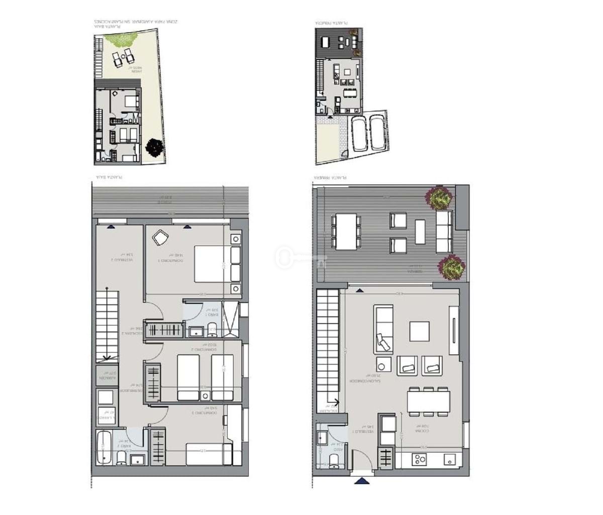 Składa się z dwóch pięter. Na piętrze, które jest wejściem do domu, znajduje się salon z jadalnią, kuchnia na otwartym planie, w pełni wyposażona i toaleta dla gości.