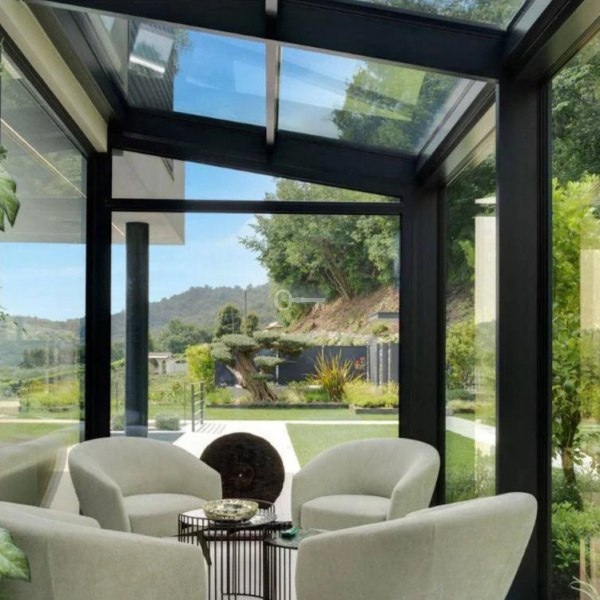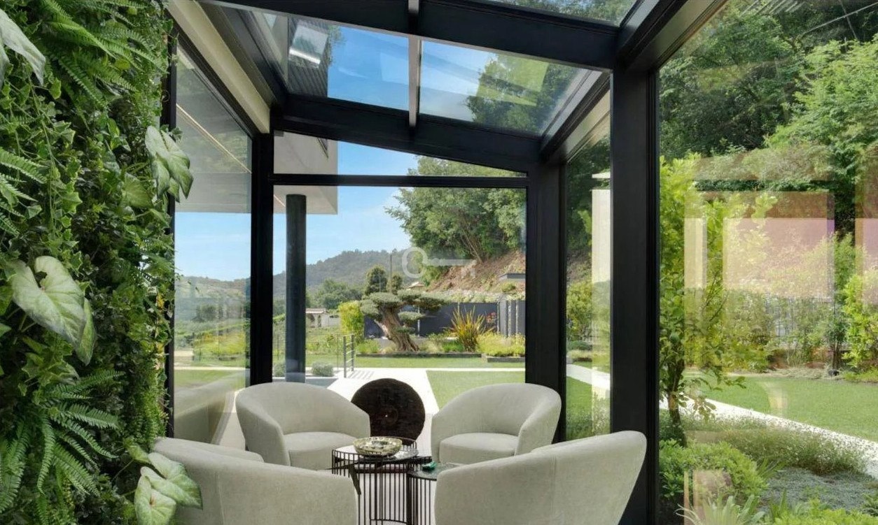 Willa obejmuje również dwie szklane oranżerie, strefę relaksu z kominkiem, siłownię i spa w ogrodzie o powierzchni 50 m², a także dwa niezależne apartamenty gościnne i mieszkanie dla personelu.