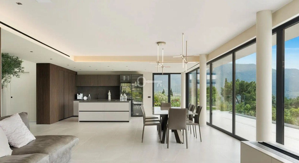 Rezydencja o powierzchni ok. 700 m² została zaprojektowana z myślą o przestrzeni, komforcie i prywatności. Składa się z 9 sypialni i 8 łazienek, rozmieszczonych na trzech poziomach. Przestronny salon o powierzchni ponad 90 m² z otwartą kuchnią i panoramicznym przeszkleniem oferuje spektakularny widok na jezioro. Centralnym punktem wnętrza jest charakterystyczne drzewo oliwne rosnące pod świetlikiem dachowym, które nadaje przestrzeni wyjątkowy charakter.