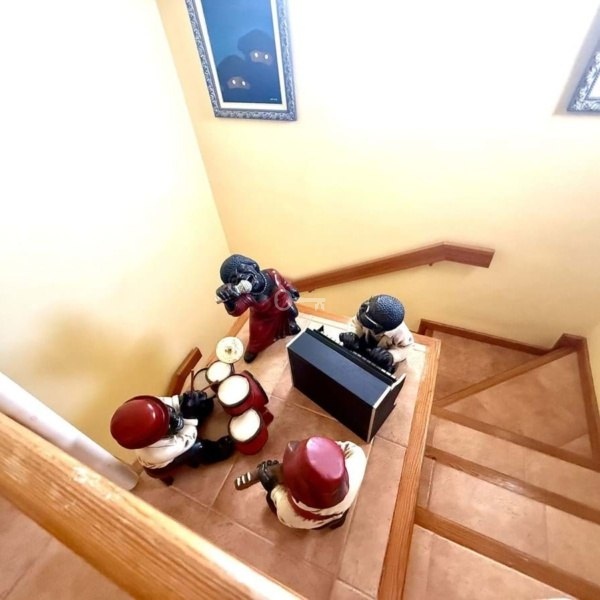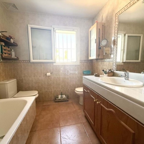 Na piętrze znajdują się trzy przestronne sypialnie i dwie w pełni wyposażone łazienki, zaprojektowane z myślą o prywatności i komforcie. Główna sypialnia ma dostęp do dużego tarasu, idealnego do podziwiania słońca i widoków. Nieruchomość posiada również piękny ogród o powierzchni 300 m², z wystarczającą ilością miejsca na budowę basenu i stworzenie osobistej oazy.