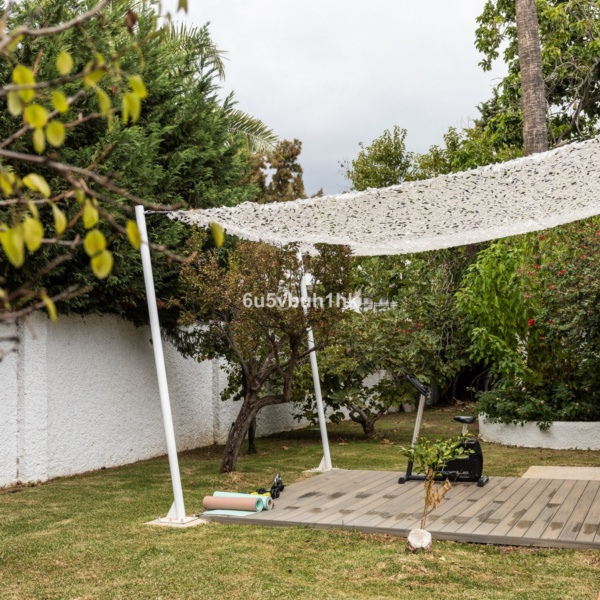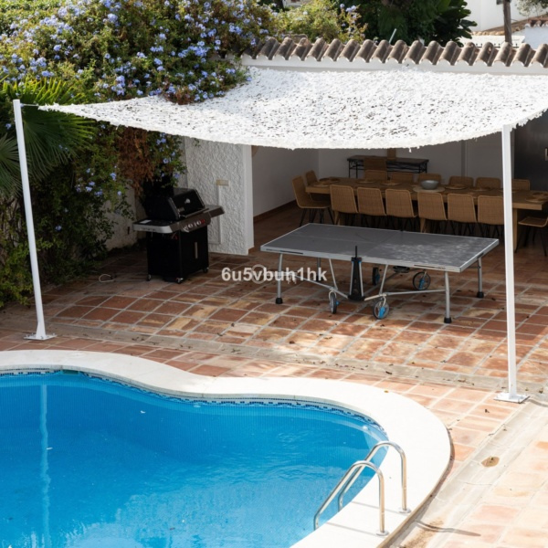 Zewnętrzna przestrzeń nieruchomości jest imponująca, z wieloma specjalnymi funkcjami, dużym basenem, bardzo dużym trawnikiem, a także mnóstwem drzew owocowych i zadaszonymi tarasami oferującymi różne obszary relaksu i rozrywki, idealne na rodzinne spotkania, w tym urocze patio w stylu andaluzyjskim. Na jednym z tarasów znajduje się komin zewnętrzny do całorocznego użytku i spożywania posiłków na świeżym powietrzu, a przy basenie znajduje się zadaszona kuchnia.