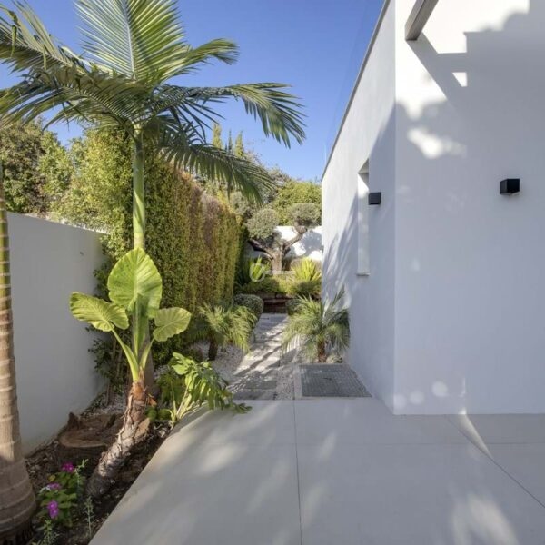 Doświadcz idealnego połączenia współczesnego designu i życia przy plaży w tej oszałamiającej nowoczesnej willi w San Pedro de Alcántara. Skąpany w naturalnym świetle dom oferuje elegancki salon na otwartym planie z przestronną kuchnią i jadalnią, gabinetem oraz główną sypialnią z prywatnym tarasem z widokiem na basen i ogród.