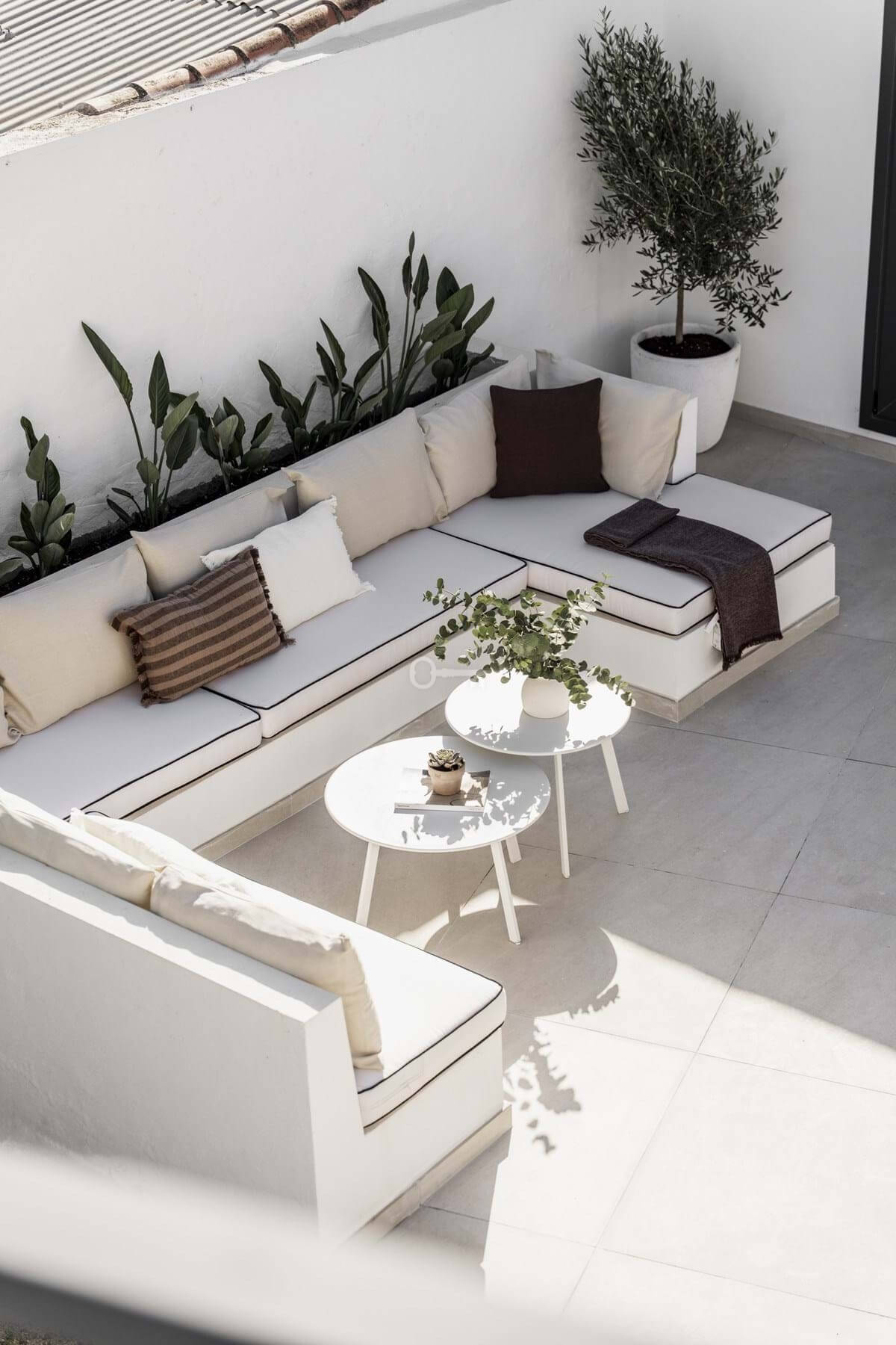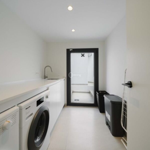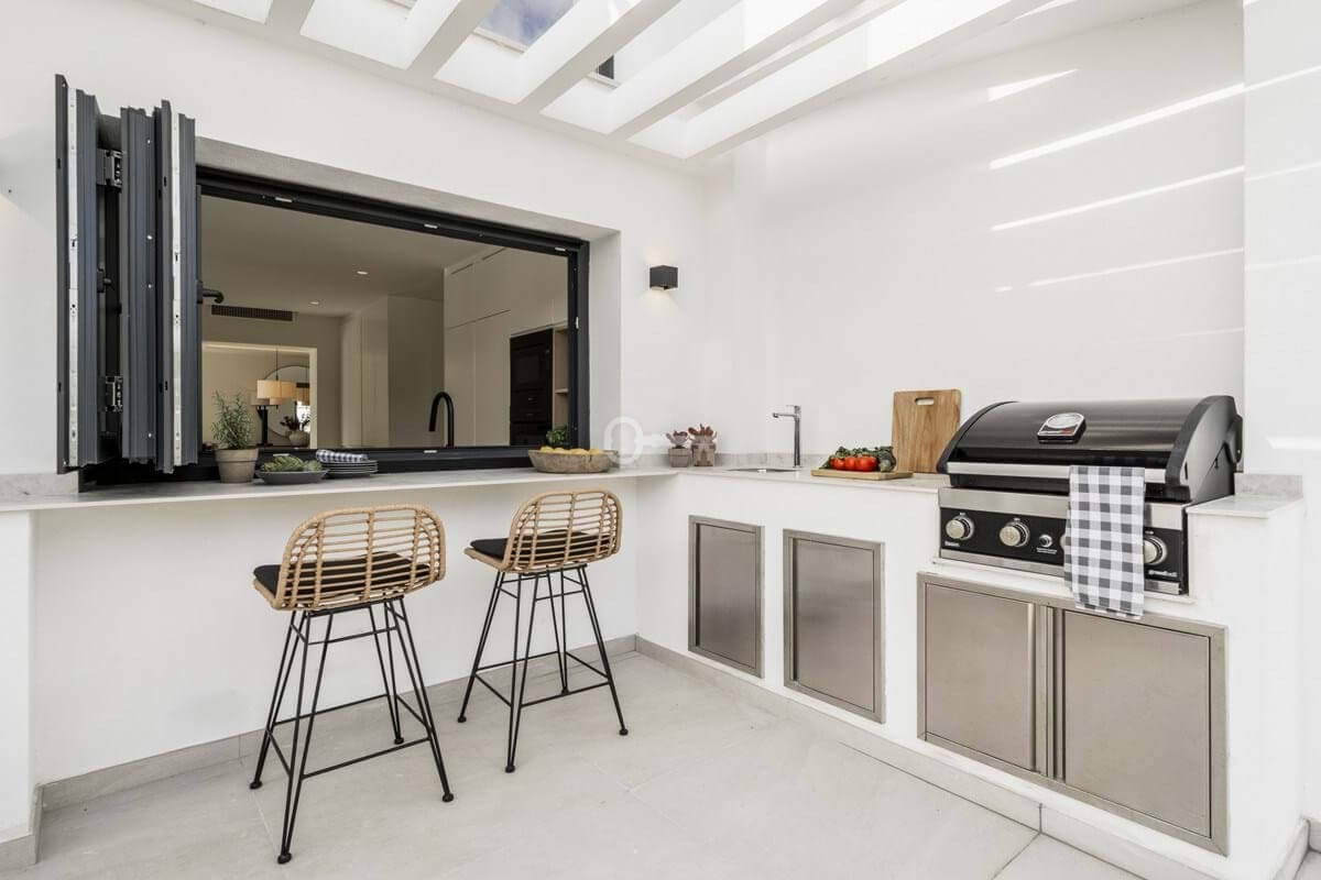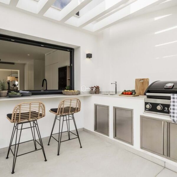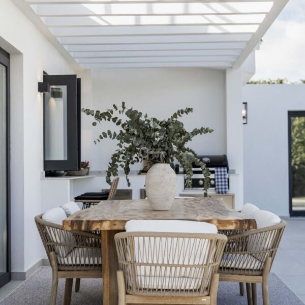 Główne przestrzenie mieszkalne łatwo łączą się z obszarami zewnętrznymi, zapewniając swobodną i otwartą atmosferę. Duże tarasy oferują mnóstwo miejsca do spożywania posiłków na świeżym powietrzu, opalania się lub po prostu cieszenia się otoczeniem. Ogród został zaprojektowany tak, aby był łatwy w utrzymaniu, a jednocześnie zapewniał przyjemne otoczenie wokół domu. Siłownia na świeżym powietrzu stanowi praktyczną funkcję dla każdego, kto ceni sobie aktywny tryb życia bez wychodzenia z domu.