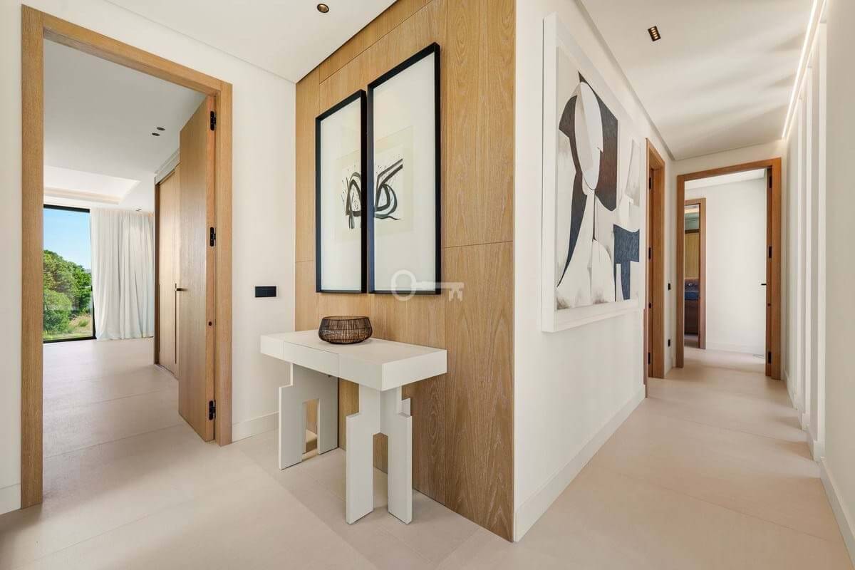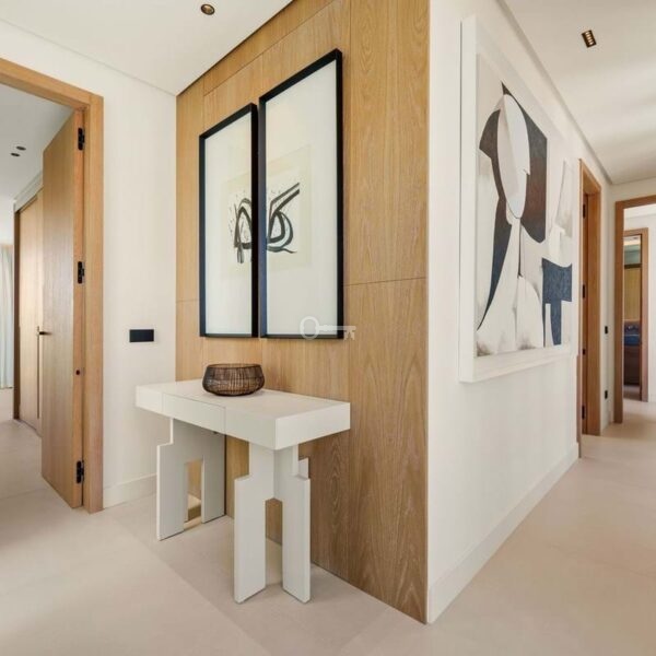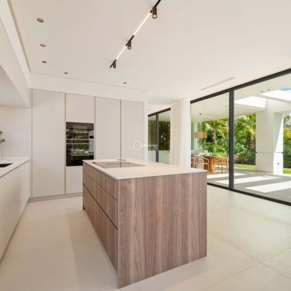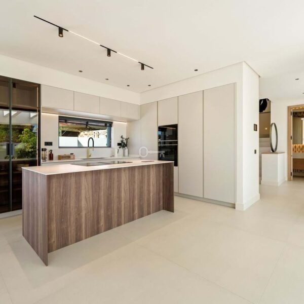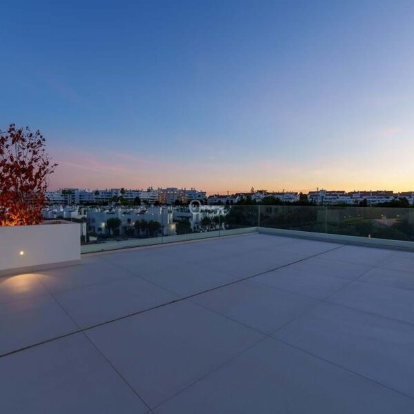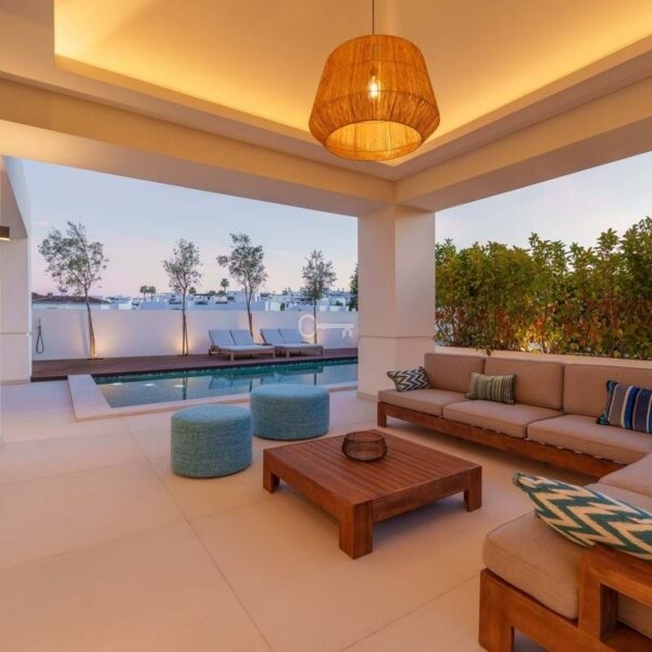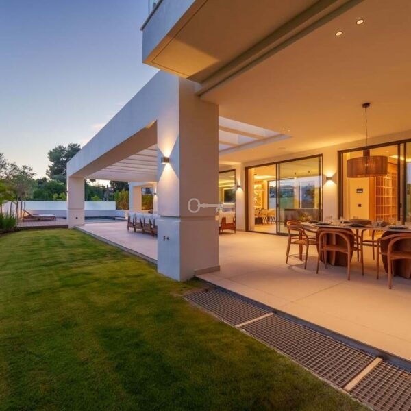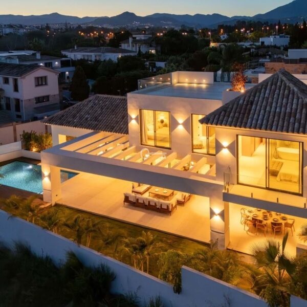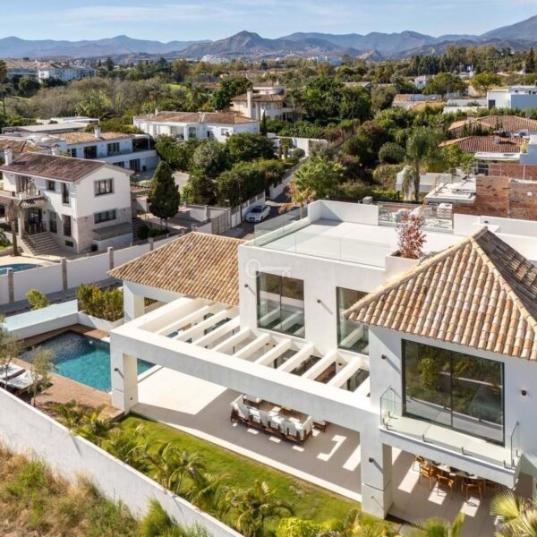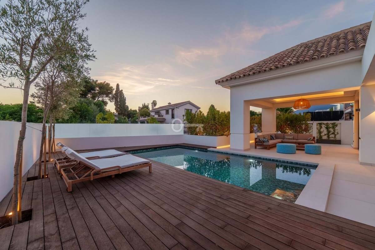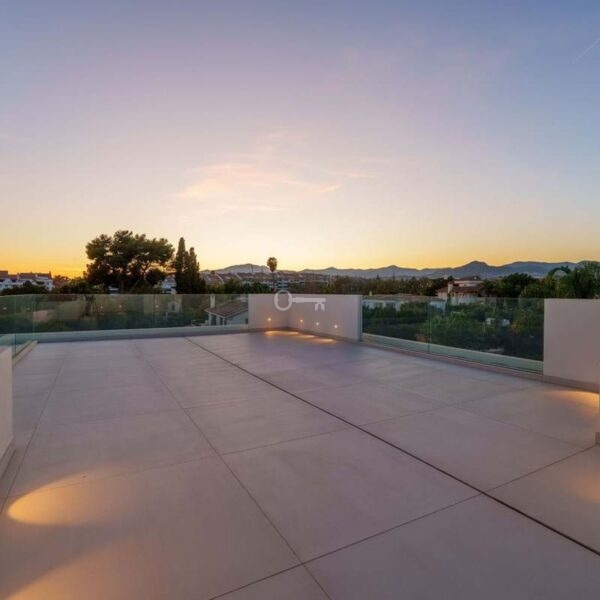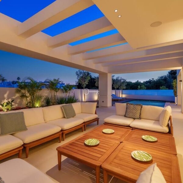 This contemporary villa in the sought-after neighborhood of San Pedro de Alcántara combines sleek architecture with luxurious amenities. Set behind clean white walls and landscaped greenery, the property offers a private oasis with a sparkling pool bordered by a stylish wooden deck and an expansive covered terrace for dining and lounging. Generous outdoor spaces, including a rooftop solarium, create the perfect setting for relaxation and entertaining.