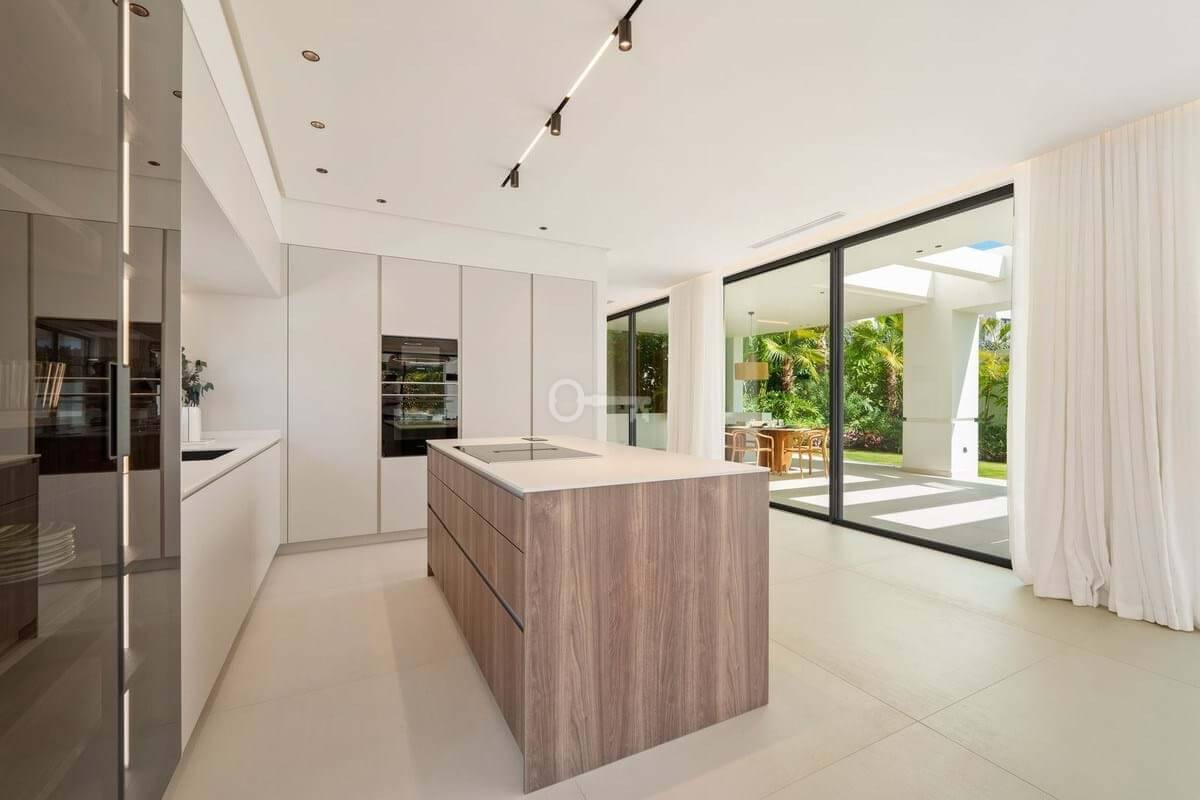 Inside, the design is bright and modern, highlighted by soft neutral tones, elegant recessed lighting, and floor-to-ceiling windows that fill the home with natural light. The open-plan living and dining area features a striking custom entertainment wall and contemporary fixtures, seamlessly flowing into the state-of-the-art kitchen. Here, a warm wood island contrasts beautifully with sleek cabinetry and integrated appliances, while a spacious dining area invites convivial meals with friends and family.