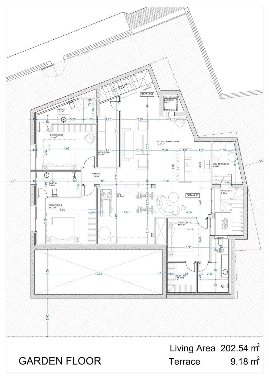 The basic features include, A/C hot&cold, fully fitted kitchen, the lift that connects three floors (garden floor/basement, the entry level/main living and the first floor/master suite), swimming pool, solar `pannels. All five bedrooms come with own en-suite bathrooms. There is a second living room in garden level with the bar and gym area and direct access to the gardens. On the top floor there is a rooftop terrace offering panoramic views. Parking space for two cars on the plot.