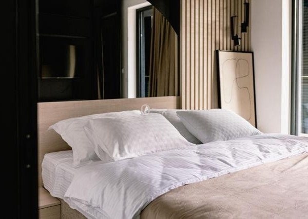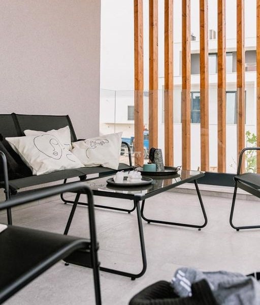 Centralne sypialnie mają dostęp do zadaszonego tarasu, natomiast główna sypialnia dysponuje prywatnym tarasem, otoczonym drewnianymi, pionowymi listwami zapewniającymi prywatność.