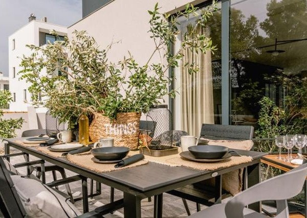 Całość została starannie zaprojektowana i udekorowana śródziemnomorską roślinnością. Po północnej stronie posesji znajduje się przestrzeń parkingowa na trzy samochody.
