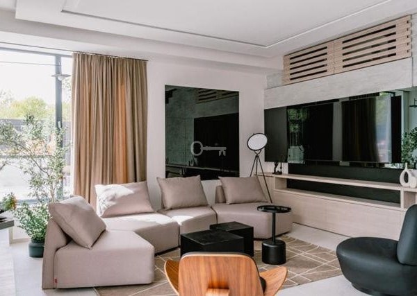 *Podwyższony salon z meblami modułowymi, designerskimi fotelami i lampami,