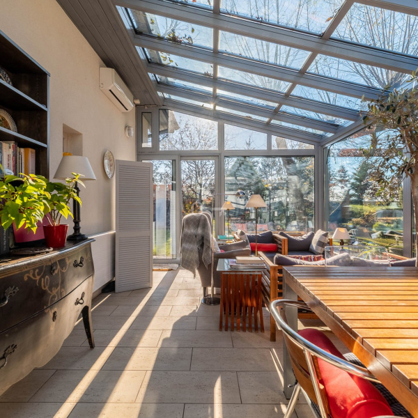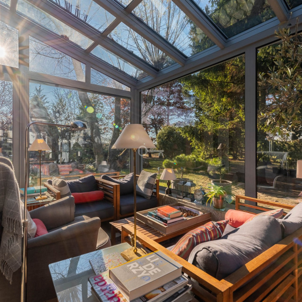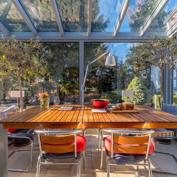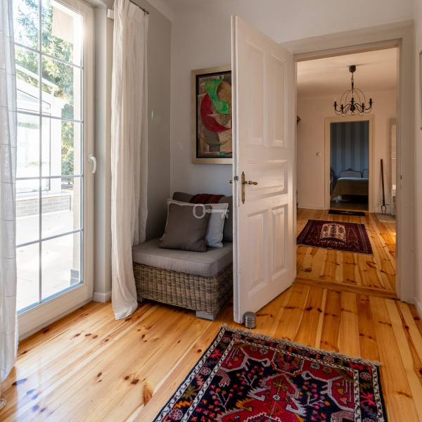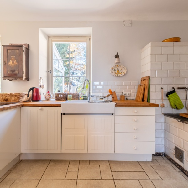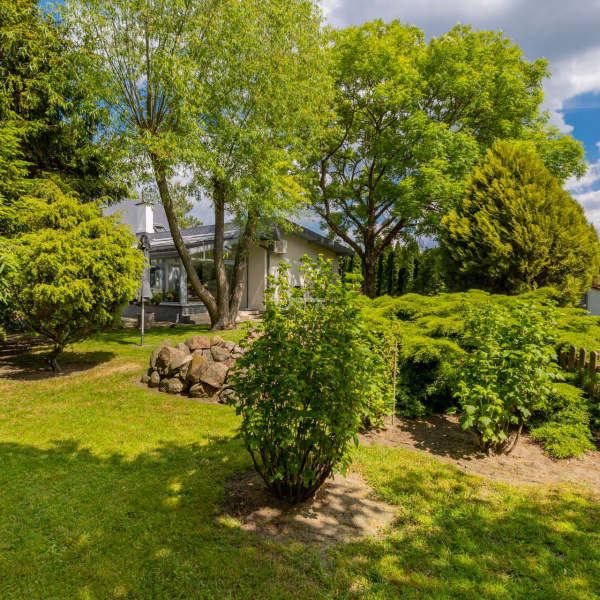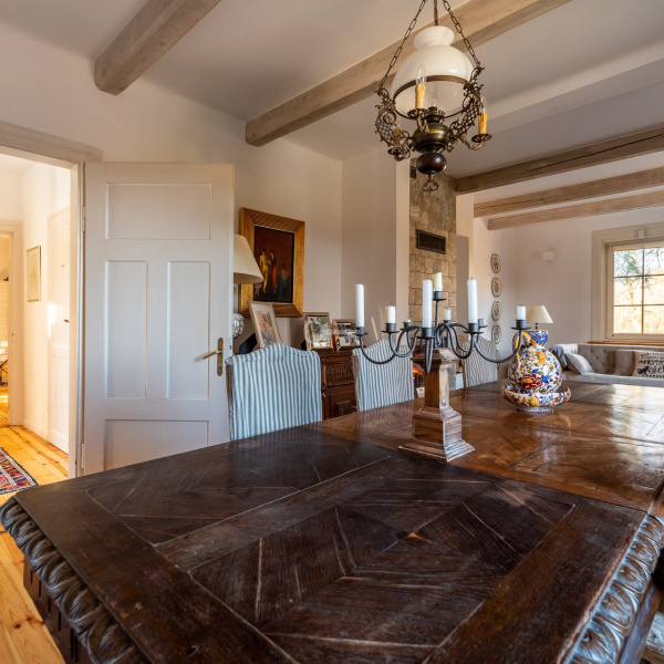 Dom w stylu rustykalnym, klimatyczny, z historią w tle. Wybudowany przed wojną w 1905 r., przetrwał ją praktycznie bez uszczerbku. Właściciele nabywając nieruchomości kilkanaście lat temu, postanowili by zachować wielość elementów historycznych – takich jak piękny piec kaflowy w kuchni, oryginalną podłogę czy kominek opalany drewnem. Wszystko celem podkreślenia prawdziwego piękna i wyjątkowości miejsca. Prócz dawnego charakteru dodano również pewien nowy akcent – oranżerię, która z czasem stała się sercem całego domu.