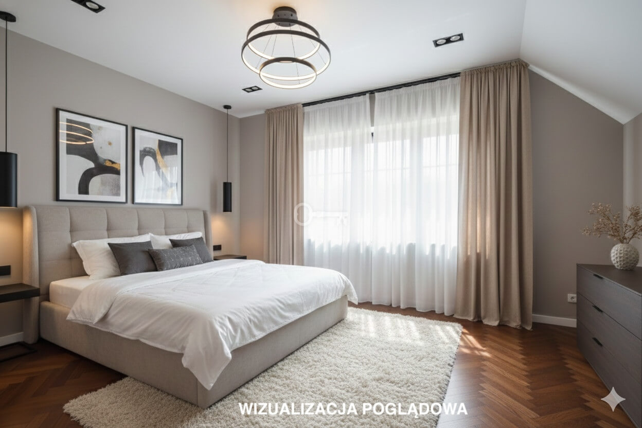Sypialnie zlokalizowane są na piętrze, w bardziej wyciszonej części domu, zgodnie z zasadą, że przestrzenie przeznaczone do odpoczynku powinny być oddzielone od głównego nurtu energii. Taki układ sprzyja regeneracji, poprawia jakość snu i wzmacnia poczucie bezpieczeństwa.