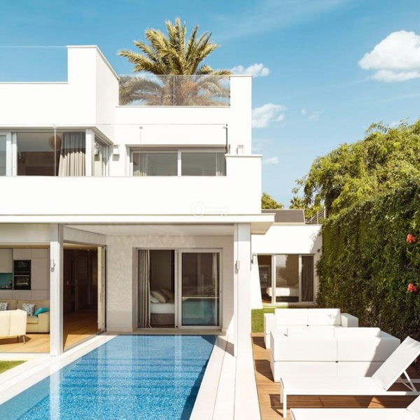 Współczesna willa przy plaży 2. linii w Puente Romano, Golden Mile-Marbella. Zbudowana na 2 poziomach, ta nieruchomość składa się z dużego salonu / jadalni na otwartym planie ze zintegrowaną nowoczesną kuchnią, w pełni wyposażoną w najwyższej jakości sprzęt AGD i dostępem do południowego tarasu, ogrodu i basenu. Na tym poziomie znajdują się 2 sypialnie, z których jedna ma dostęp do ogrodu. Na górnym poziomie znajduje się główna sypialnia z łazienką, garderobą i dostępem do tarasu z zapierającymi dech w piersiach widokami na morze, a także dodatkowa dwuosobowa sypialnia z łazienką. Nieruchomość uzupełnia niezależna sypialnia z łazienką na parterze z osobnym dostępem, idealna dla personelu lub gości. Dodatkowe funkcje obejmują: ogrzewanie podłogowe, klimatyzację, marmurowe podłogi, duży basen, system alarmowy, rolety antywłamaniowe, drewniane podłogi itp.