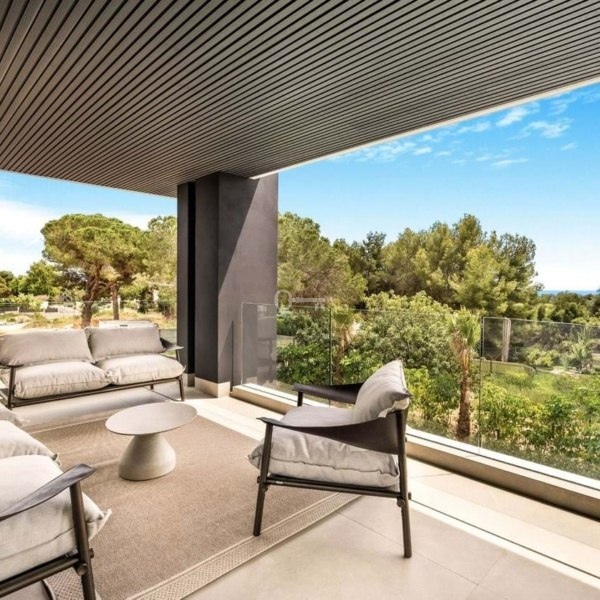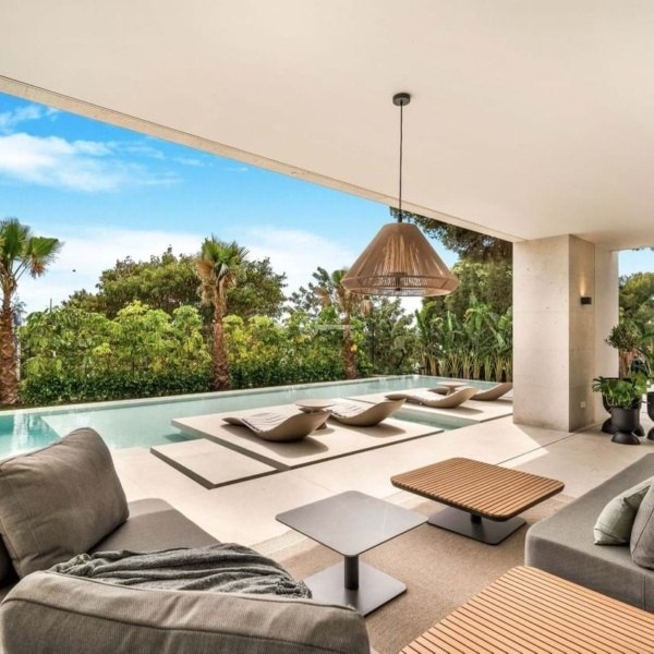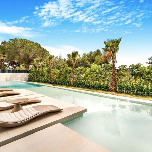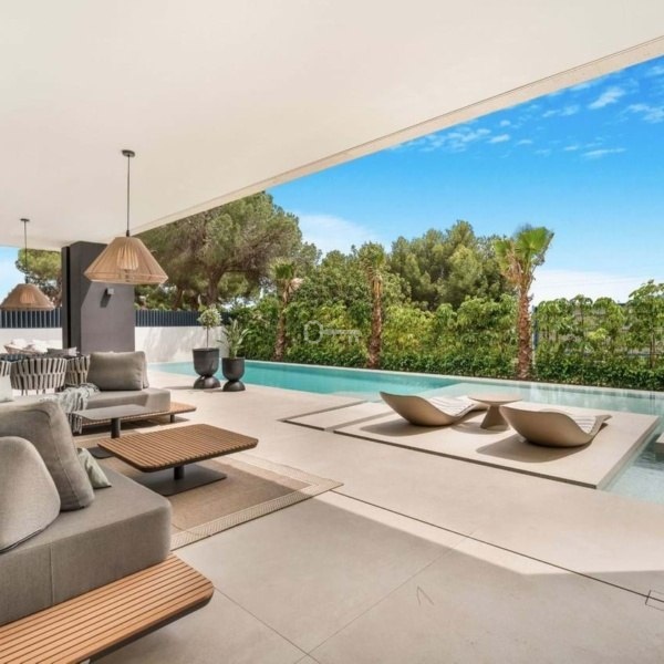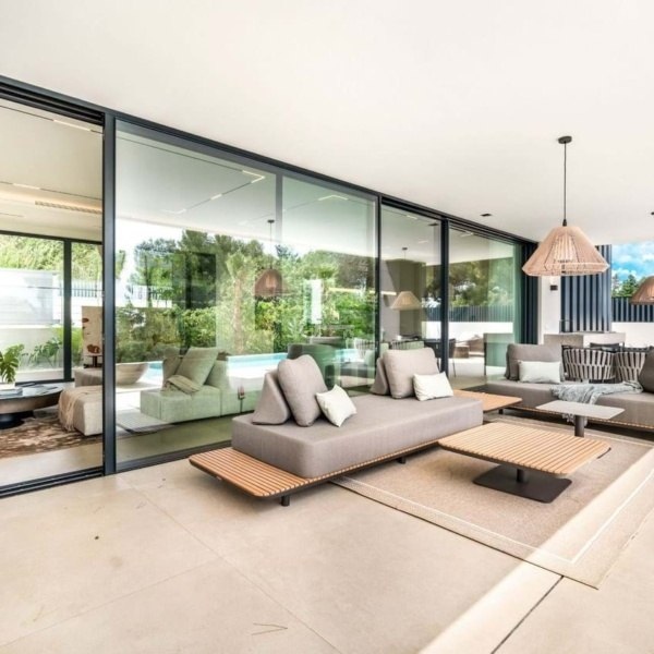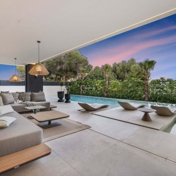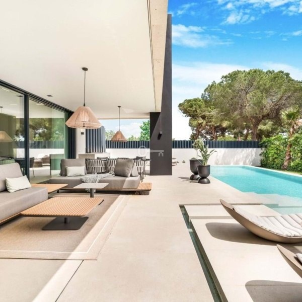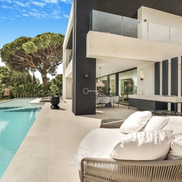 Willa o łącznej powierzchni zabudowy 813 m² na działce o powierzchni 1 050 m² została starannie zaprojektowana z najwyższej jakości materiałów i dużych okien, które harmonijnie łączą wnętrza z naturalnym otoczeniem. Majestatyczne sosny na posesji tworzą wyjątkową i spokojną śródziemnomorską atmosferę.