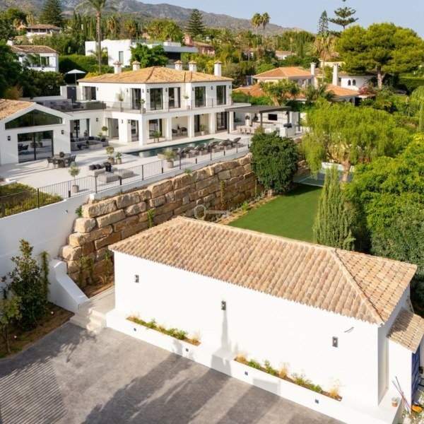 Ta w pełni odnowiona willa w stylu andaluzyjskim znajduje się w Rocío de Nagüeles, jednej z najbardziej prestiżowych enklaw Marbellas Golden Mile. Położona na działce o powierzchni 1,965 m² od strony południowej pod charakterystyczną górą La Concha, oferuje wspaniałe widoki na Morze Śródziemne. Zmodernizowana w 2025 r. rezydencja rozciąga się na ponad 734 m², gdzie strzeliste sufity, przeszklenia od podłogi do sufitu i płynne przejścia między wnętrzem a zewnętrzem podkreślają jej świetlisty design.