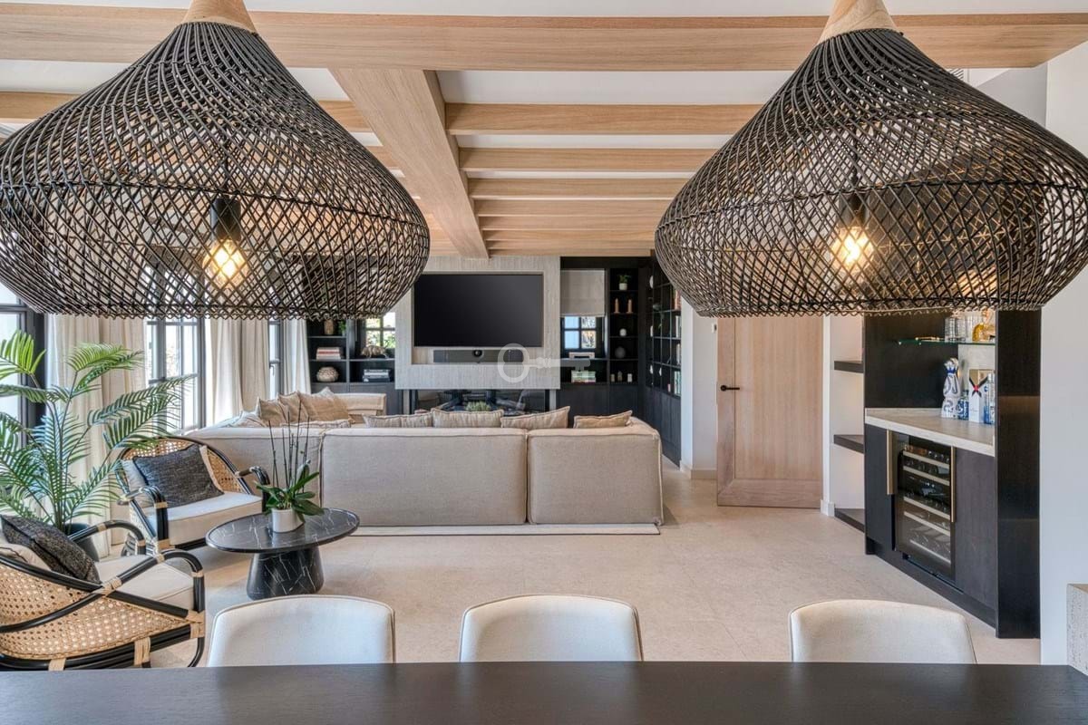 Wchodzisz do tego oszałamiającego domu przez zalany słońcem dziedziniec, idealny do spożywania posiłków na świeżym powietrzu, i wkraczasz do domu, w którym każdy szczegół został starannie wyselekcjonowany. Na głównym piętrze znajduje się designerska kuchnia z wbudowanymi urządzeniami Gaggenau, centralną wyspą i przestronną jadalnią. Salon na otwartym planie jest otoczony wapiennymi dębowymi belkami stropowymi i dużymi przesuwanymi drzwiami, które prowadzą na przestronny taras, zalewając przestrzeń światłem i łącząc życie wewnątrz i na zewnątrz. Niższy poziom zapewnia komfort i rozrywkę, oferując prywatny salon kinowy z dużą sofą, dodatkową kuchnię i bar, ekspozycję win oraz dwa pięknie urządzone apartamenty dla gości, każdy z własną łazienką i dostępem do zadaszonego tarasu. Na piętrze znajduje się główna sypialnia z garderobą, w pełni wyposażoną łazienką i piękną wolnostojącą wanną. Czwarta sypialnia uzupełnia poziom, idealny dla rodziny lub dodatkowych gości.