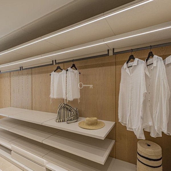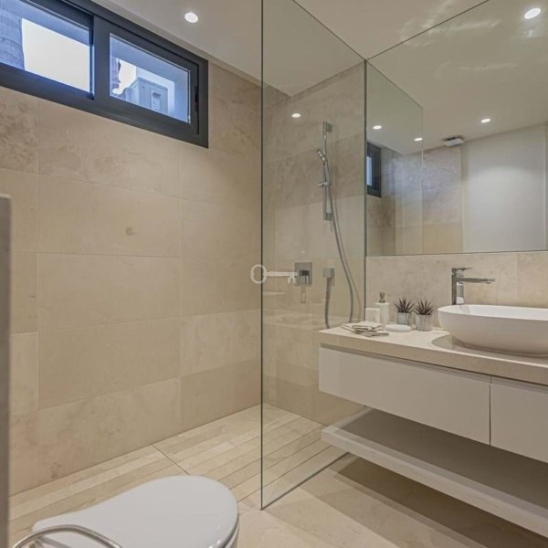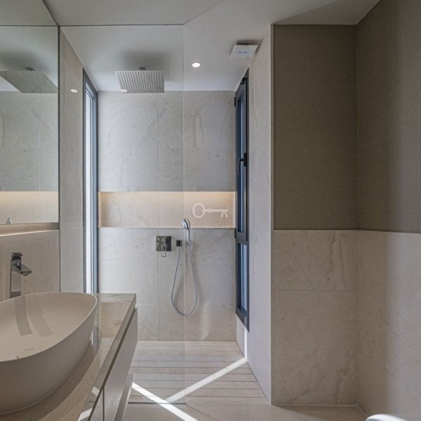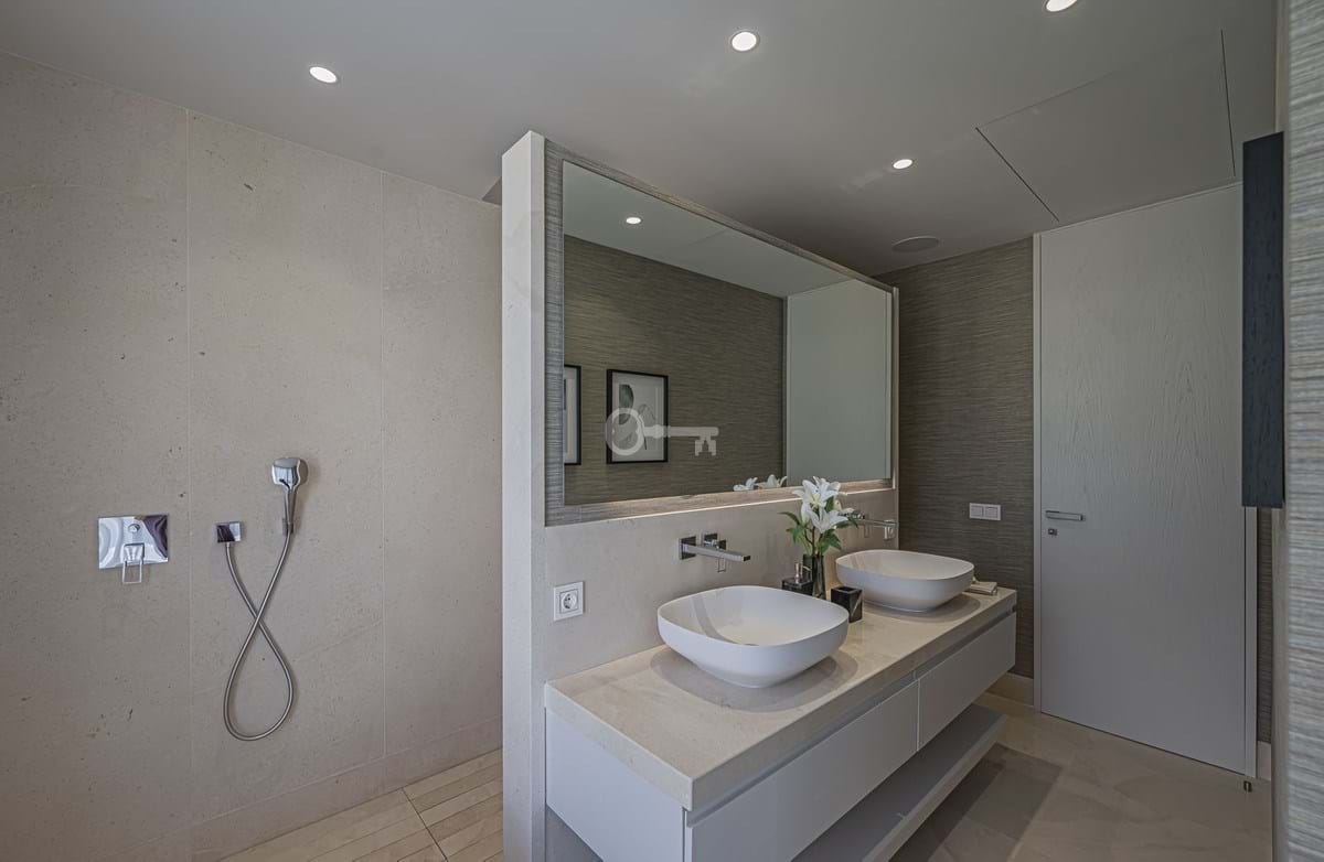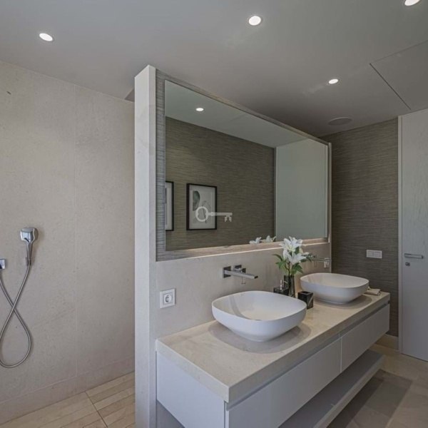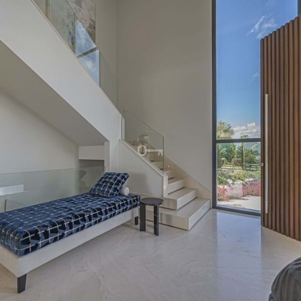 Elegancka willa w nowoczesnym stylu rozłożona na trzech i czterech piętrach z pięcioma sypialniami, pięcioma łazienkami, dużym salonem z otwartą kuchnią i jadalnią, spektakularną piwnicą z kinem domowym, barem, stołem bilardowym i dużym solarium z pięknym widokiem na morze i góry.