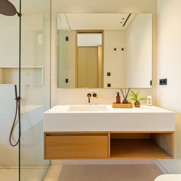 Układ został starannie zaprojektowany, aby zharmonizować intymne rodzinne chwile z otwartym życiem towarzyskim. Jasny salon i jadalnia na otwartym planie witają przy wejściu, połączone z wyrafinowaną kuchnią z jasnego drewna, która zakotwicza społeczny rdzeń domu. Rozległe szklane drzwi od podłogi do sufitu rozpuszczają granice między wnętrzem a zewnętrzem, prowadząc do szerokich tarasów i bujnych ogrodów skąpanych w śródziemnomorskim świetle. Na tym poziomie znajduje się również prywatny apartament dla gości z niezależnym dostępem do tarasu, zapewniający najwyższy komfort i dyskrecję.