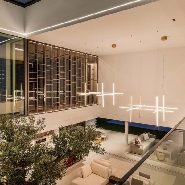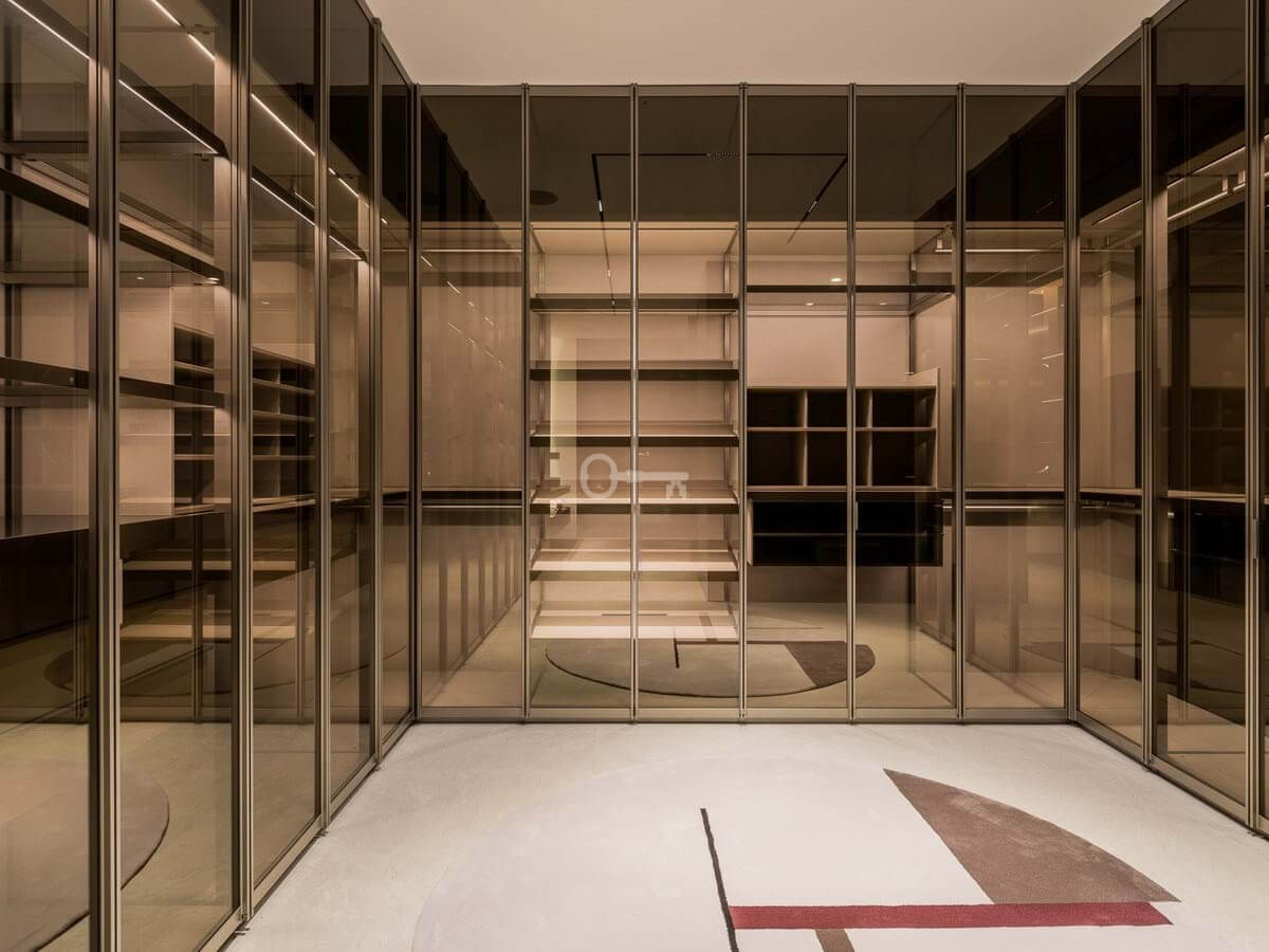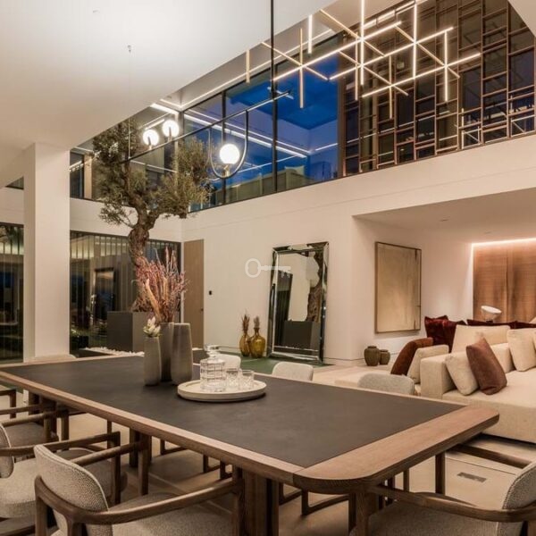 Na parterze pragmatyczna sypialnia z łazienką sąsiaduje z przestronnym salonem-jadalnią, który płynnie integruje się z w pełni wyposażoną kuchnią i tarasami, zapewniając dostęp do ogrodu z towarzyszącym mu basenem. Na piętrze znajdują się trzy sypialnie, każda z własnym tarasem i panoramicznym widokiem. Główna sypialnia posiada przestronną garderobę. W piwnicy znajduje się duże pomieszczenie wielofunkcyjne, pralnia, toaleta dla gości, sypialnia z łazienką, sala kinowa, bar z recepcją oraz garaż z miejscem na sześć samochodów.