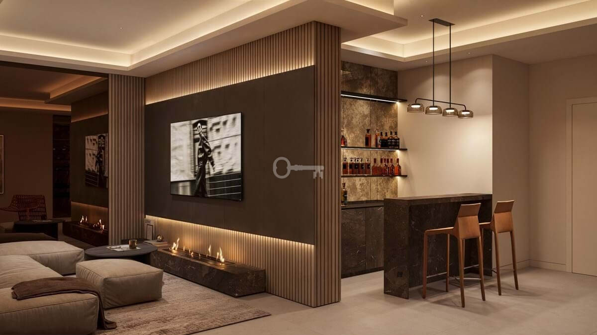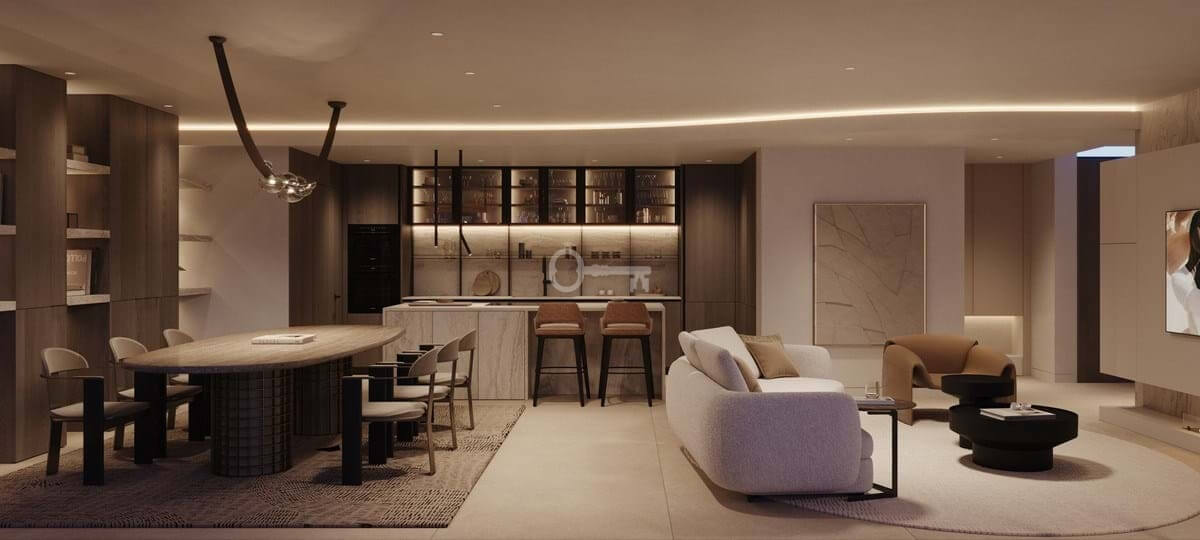 The main floor opens onto a majestic open-plan living room, which integrates the living and dining areas with direct access to the spacious terraces and infinity pool. The modern kitchen, equipped with state-of-the-art appliances, is the social heart of the home. On this same level is an elegant en-suite guest bedroom and a guest toilet.