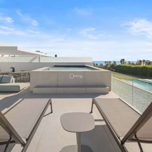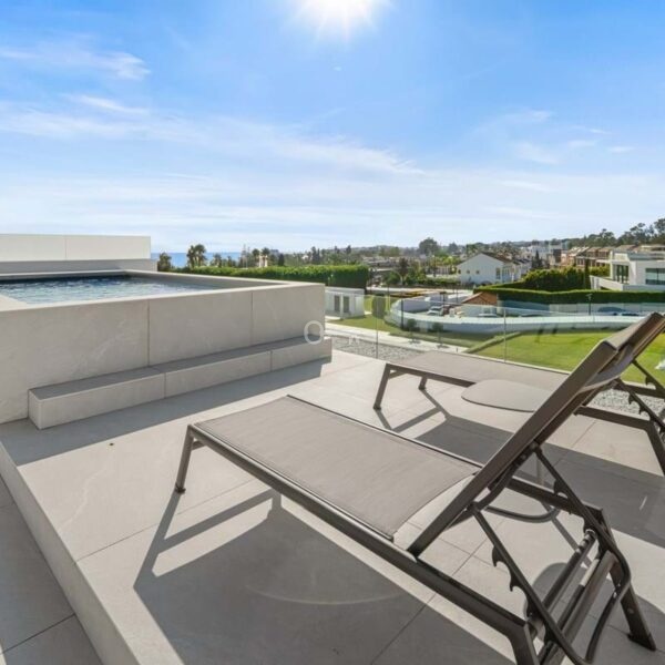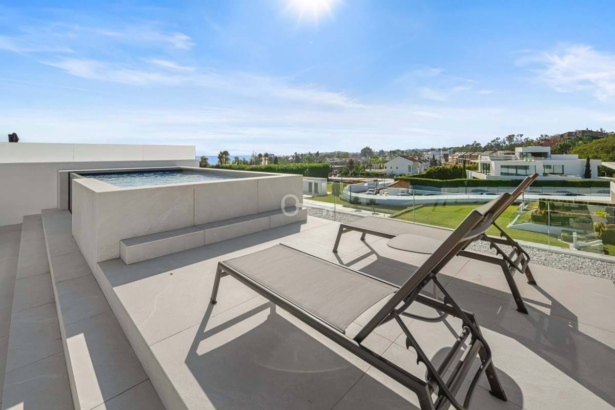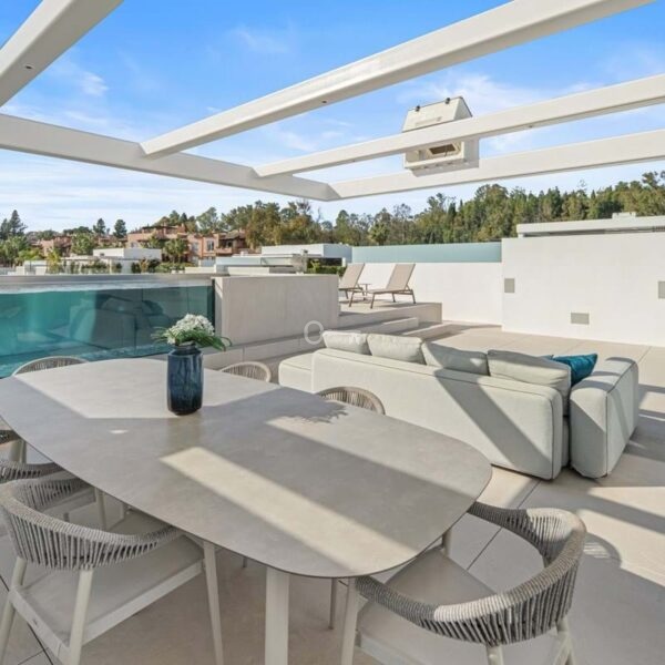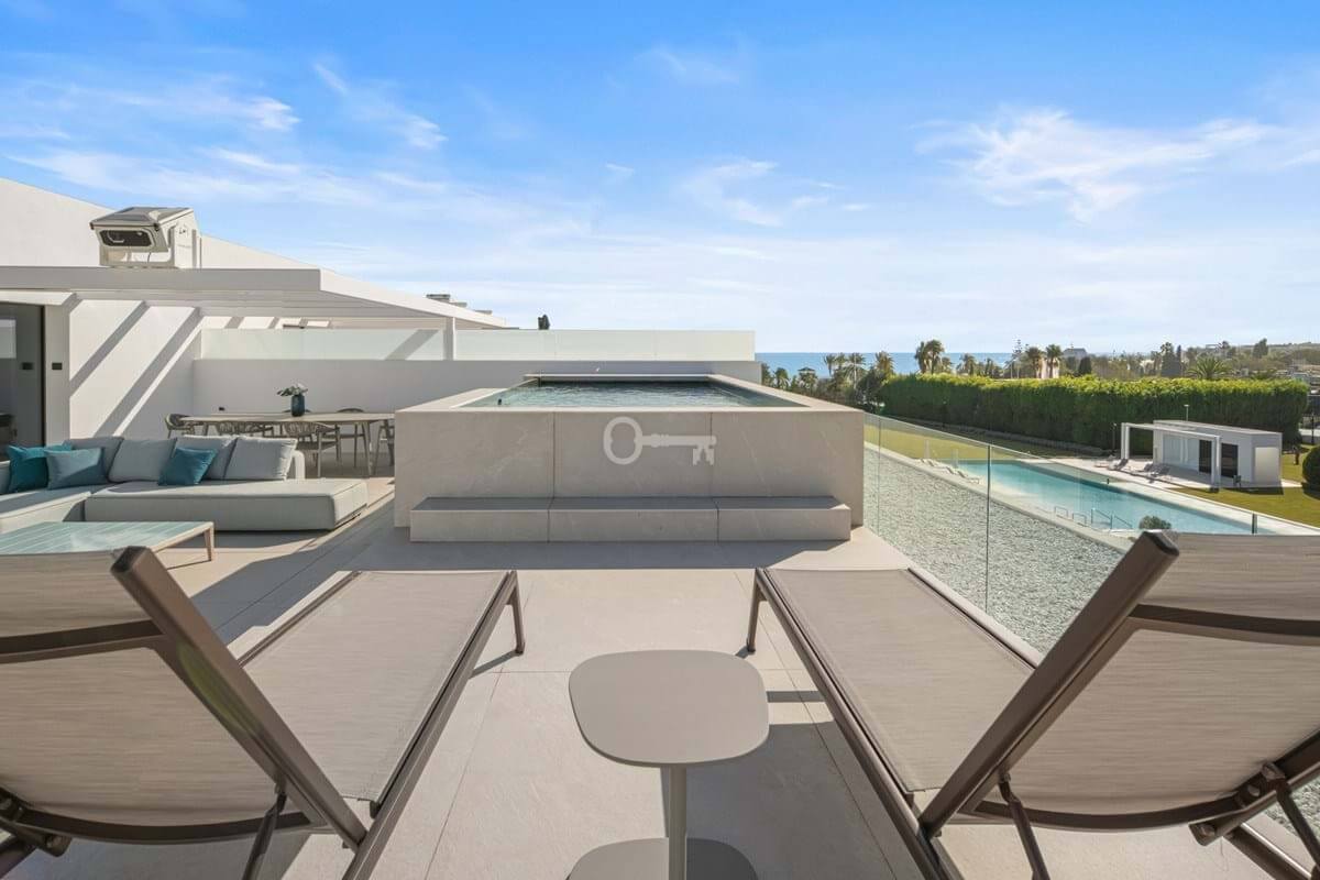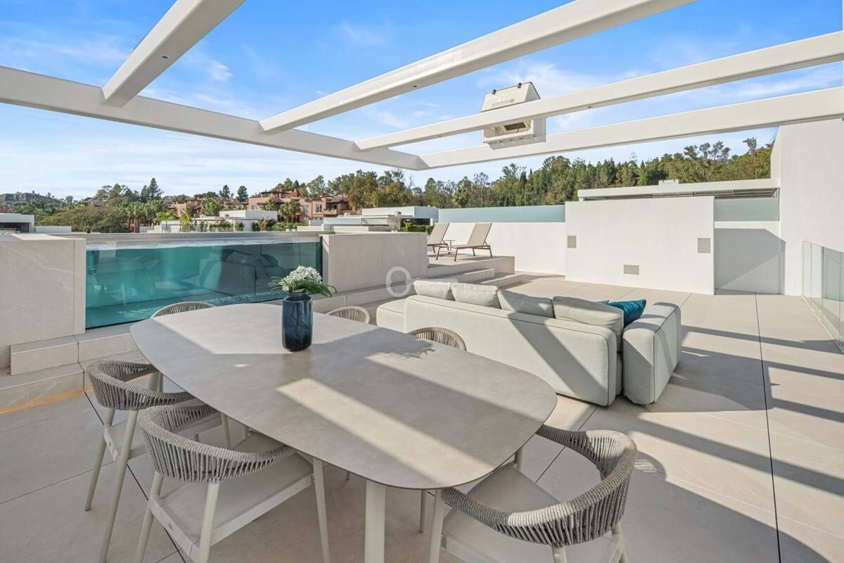 Above it all, the rooftop terrace becomes the setting that quietly defines the home. A private pool runs along the edge with space for dining, lounging and evening gatherings beneath a pergola, opening to views across the Golden Mile and the Mediterranean. Set within a secure boutique community and within walking distance of Puente Romanos restaurants, beach clubs and promenade, Villa 7 balances privacy with immediate access to Marbellas most social stretch of coastline.