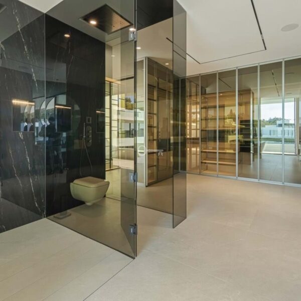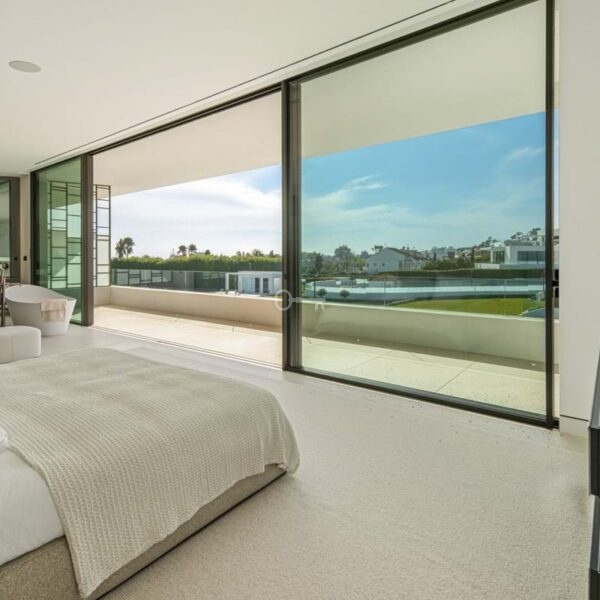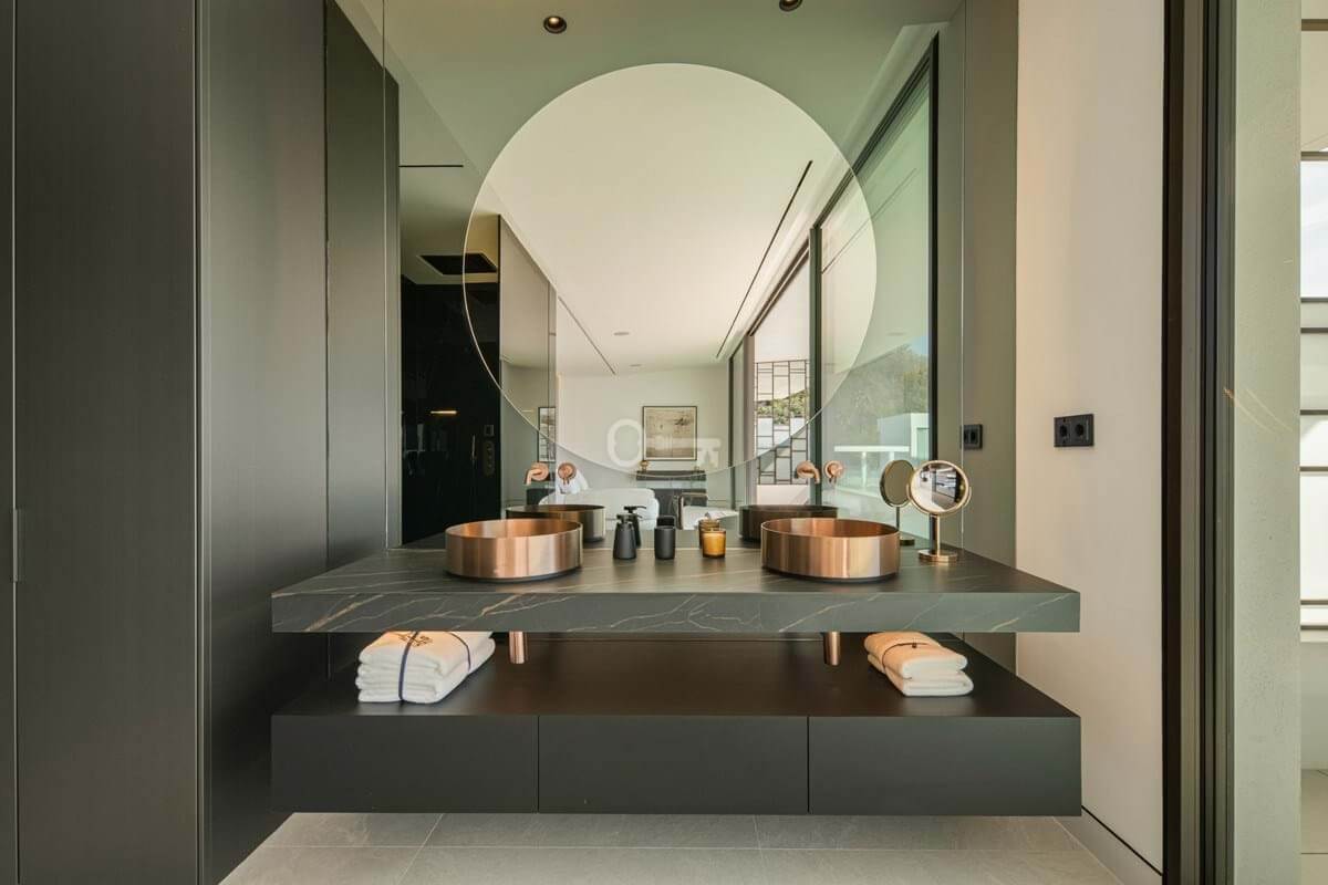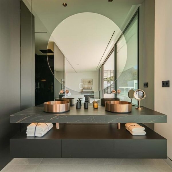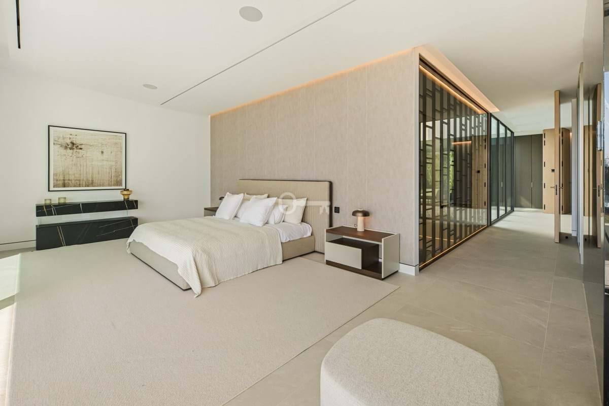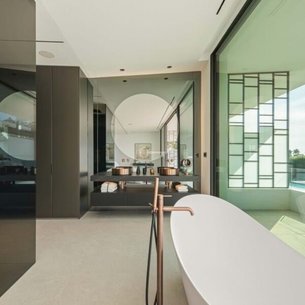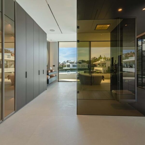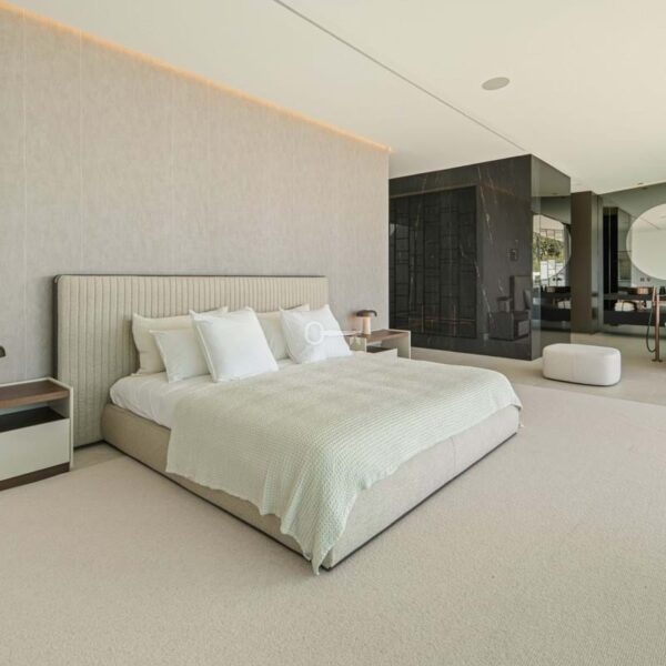 The upper level is dedicated to the bedroom suites. The principal suite stretches across the façade with sea-facing glazing, private terrace access and a sculptural bathroom with freestanding bath and integrated dressing space. Two additional guest suites follow the same understated design language of light stone, clean lines and garden-facing glazing.