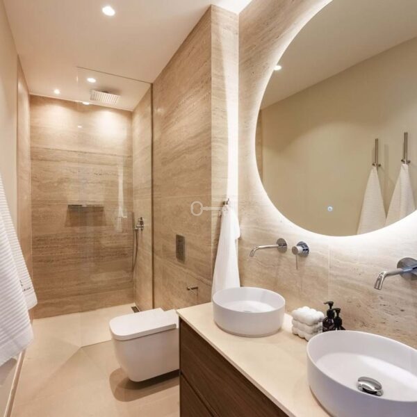 Inside, the villa embraces a modern open-concept layout with floor-to-ceiling glass bi-folding doors that flood the living areas with natural light and provide seamless indoor-outdoor integration. Each of the five bedrooms is spacious and thoughtfully appointed, offering a tranquil retreat with access to natural light and outdoor spaces. Bathrooms feature premium materials and finishes, reflecting both functionality and elegance.