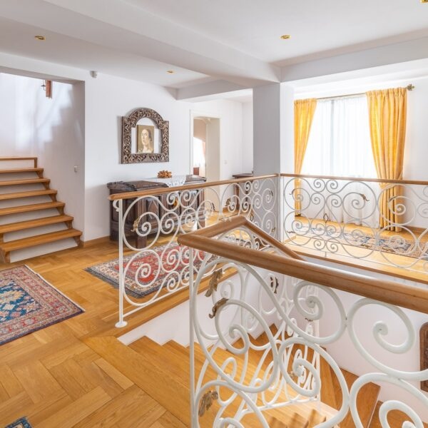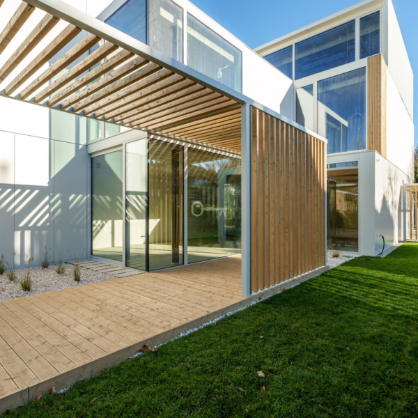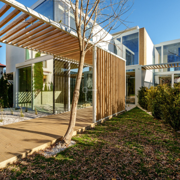 Dom wykończony w podwyższonym standardzie deweloperskim, z automatycznymi bramami garażowymi wbudowanymi w elewację z płyty HPL oraz aluminiową konstrukcją fasady. Wyposażony w ogrzewanie podłogowe w wybranych pomieszczeniach, wentylację mechaniczną z odzyskiem ciepła oraz rekuperator marki Zender. Dodatkowo, zamontowano klimatyzację, centralny odkurzacz, instalację elektryczną oraz Internet z telewizją.