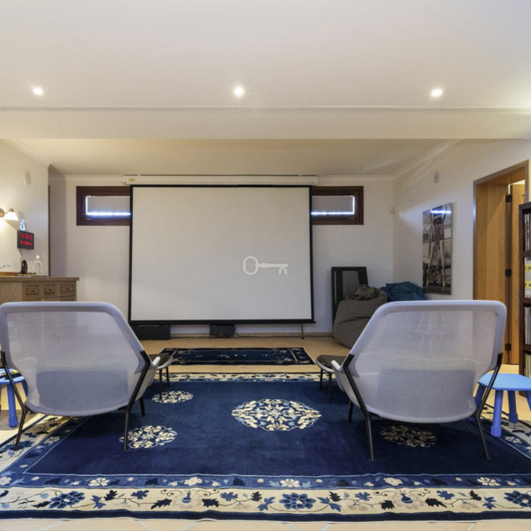 Willa oferuje pięć sypialni z łazienkami oraz dodatkowy apartament z aneksem kuchennym – idealny dla gości. Wnętrza obejmują dwupoziomowy salon z biblioteką i galerią, salę kinową z barem i systemem dźwięku przestrzennego, nowoczesną kuchnię letnią z grillem klasy premium oraz strefę wellness z turecką łaźnią, siłownią i jacuzzi.