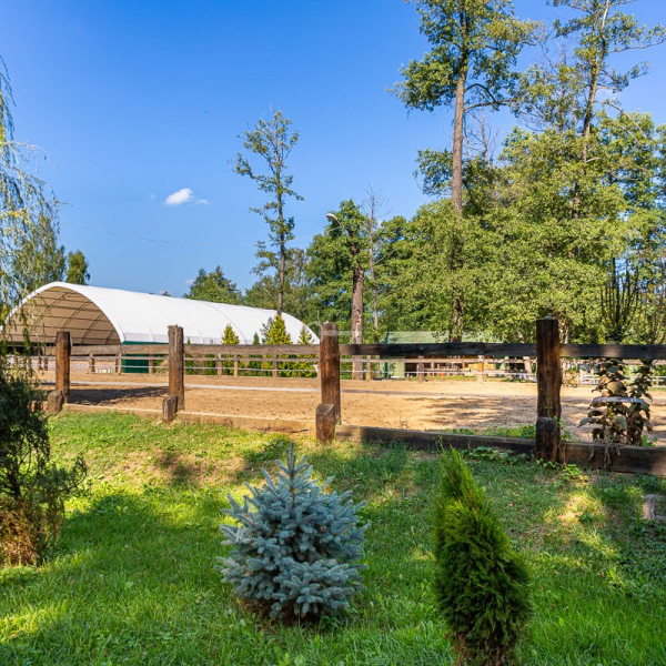 Dom połączony ze stajnią, ujeżdżalnia dla koni oraz domek stajennego są już zbudowane i stanowią integralną część nieruchomości.