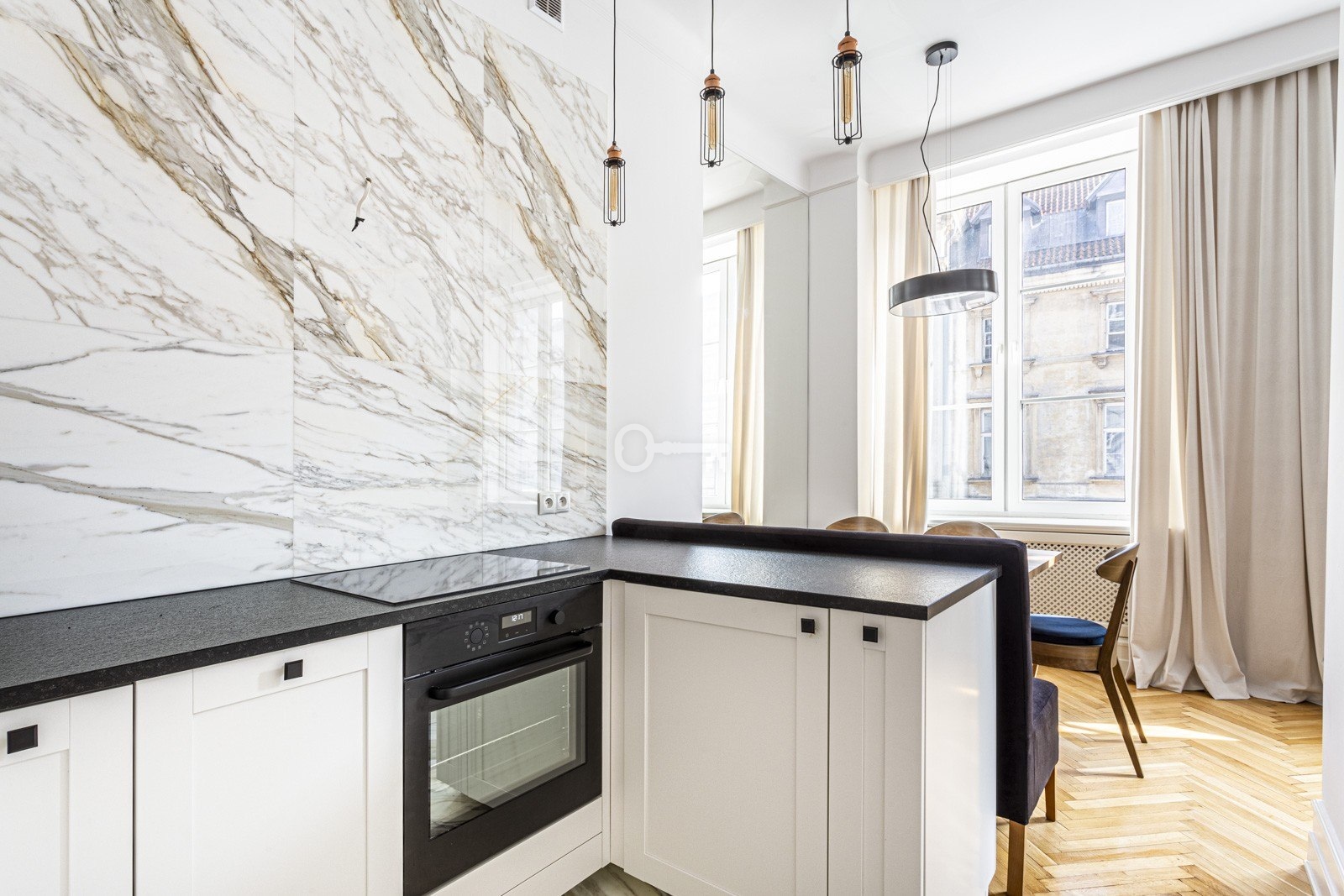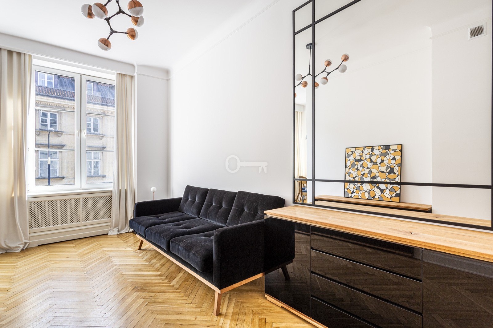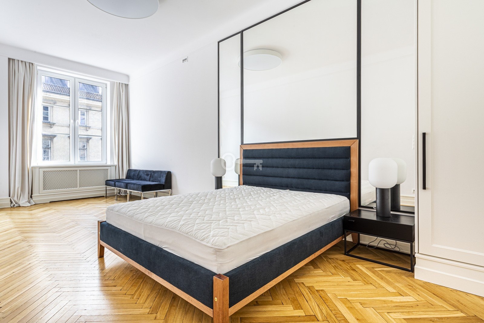 Mieszkanie jest wyjątkowo jasne dzięki dużym oknom wychodzącym na południowy wschód, a efekt potęgują jasne wykończenia – parkiet, zasłony i akcenty z kamienia. Wysokiej jakości materiały, takie jak marmurowa cegiełka w łazience czy granitowe blaty kuchenne, wyróżniają to wnętrze na tle innych ofert wynajmu. Przestronna sypialnia umożliwia wygodne zaaranżowanie m.in. stolika gabinetowego lub toaletki. Liczne szafy w zabudowie zapewniają dużo miejsca do przechowywania.