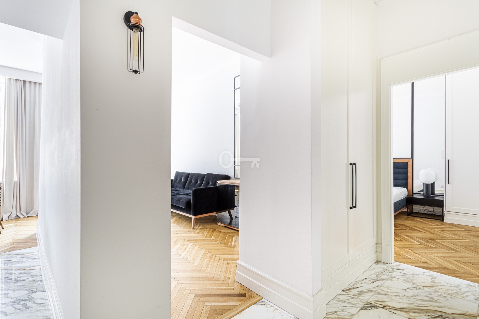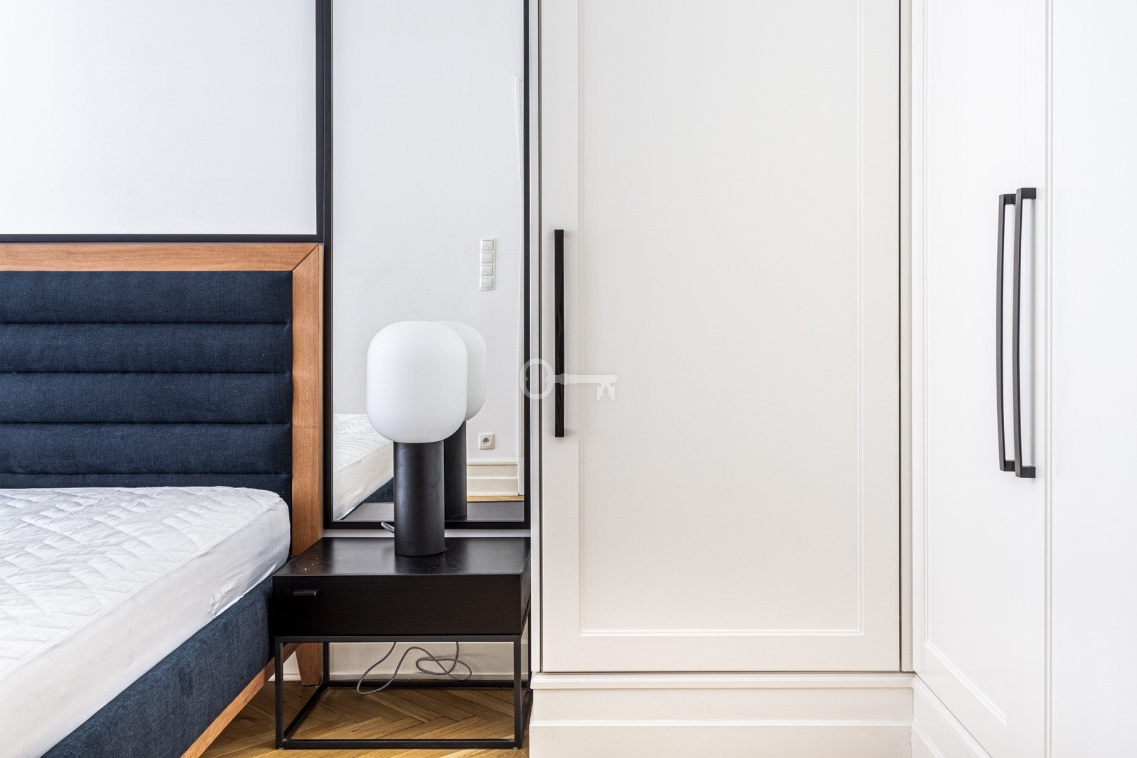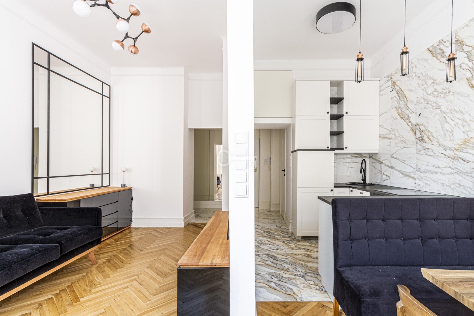 Mieszkanie jest wyjątkowo jasne dzięki dużym oknom wychodzącym na południowy wschód, a efekt potęgują jasne wykończenia – parkiet, zasłony i akcenty z kamienia. Wysokiej jakości materiały, takie jak marmurowa cegiełka w łazience czy granitowe blaty kuchenne, wyróżniają to wnętrze na tle innych ofert wynajmu. Przestronna sypialnia umożliwia wygodne zaaranżowanie m.in. stolika gabinetowego lub toaletki. Liczne szafy w zabudowie zapewniają dużo miejsca do przechowywania.