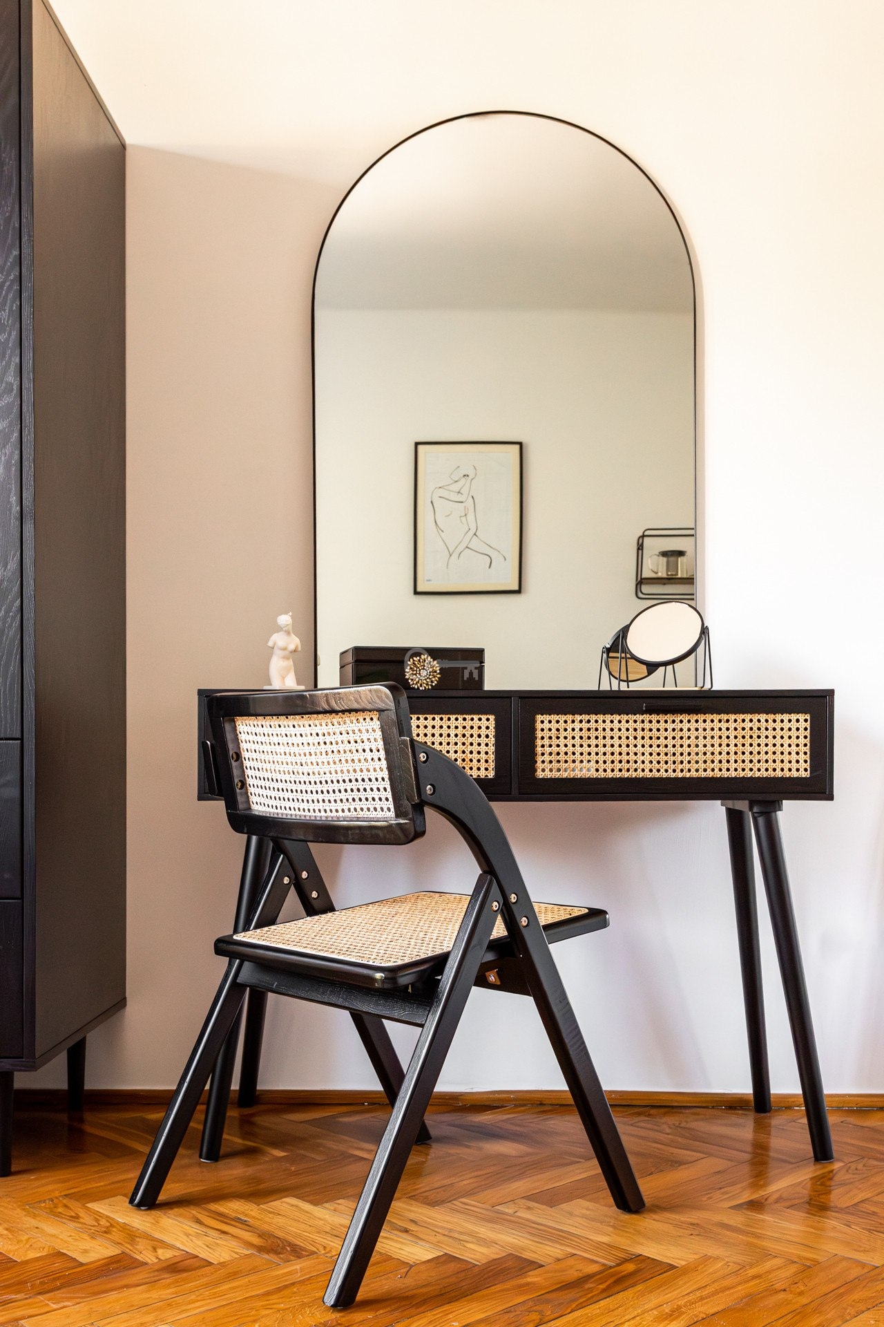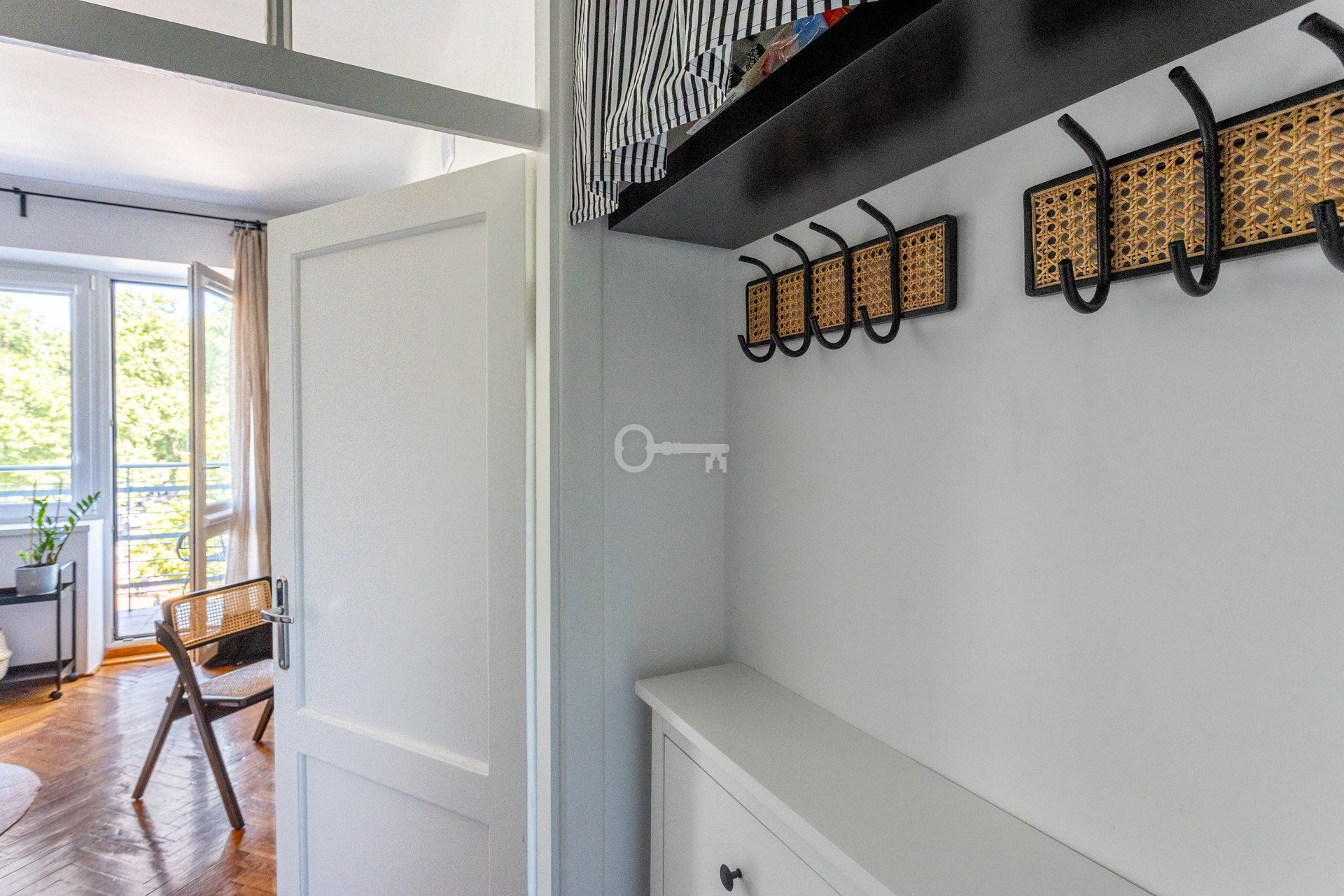 * przedpokoju z wieszakiem i szafką na buty,