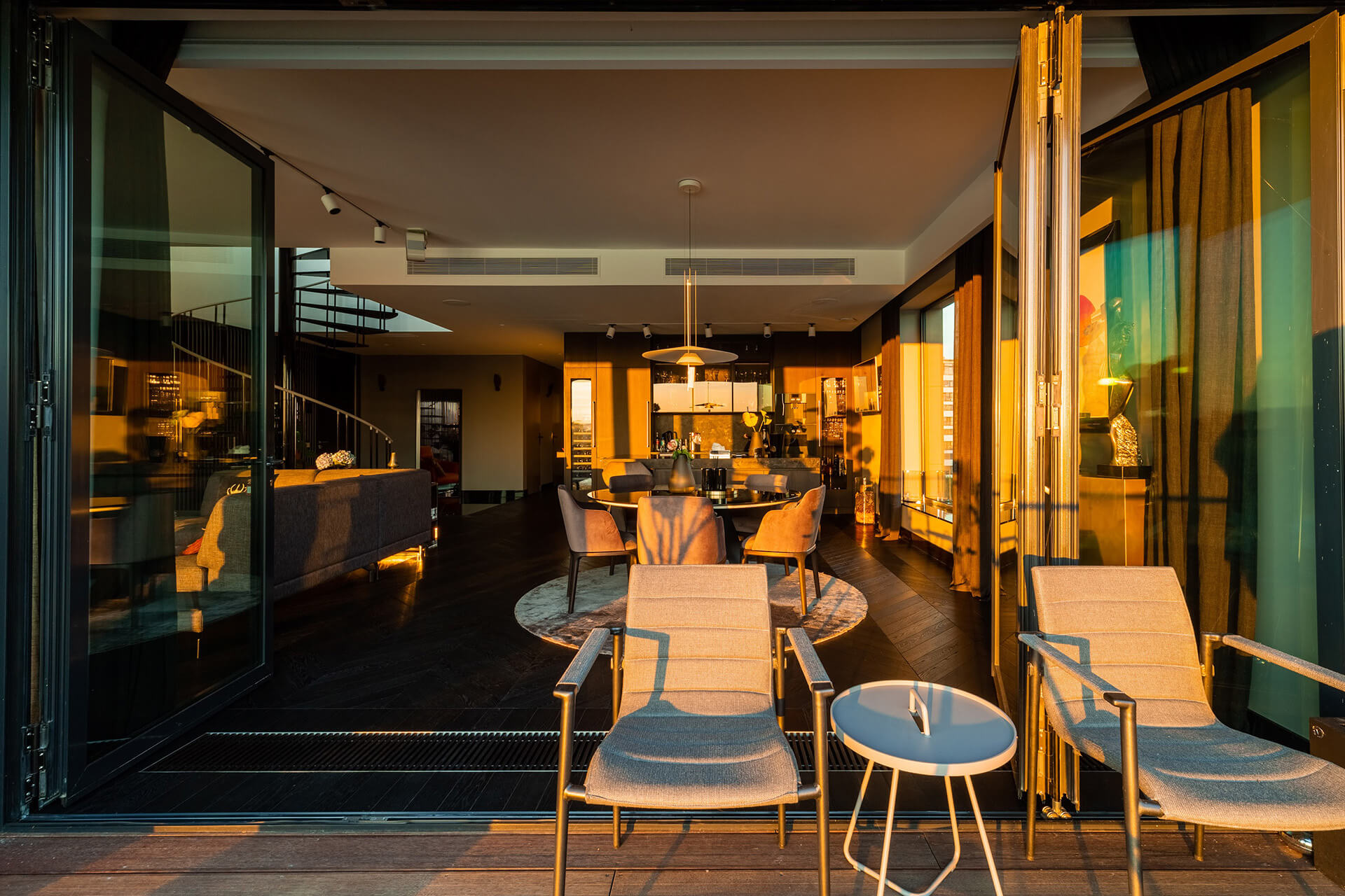Z tej staranności o wnętrze wynika naturalna konsekwencja – taras przestaje być dodatkiem i staje się przedłużeniem salonu użytkowanym przez cały rok, dzięki systemom pergoli oraz ogrzewaniu zewnętrznemu. Standardem projektowym pozostają powierzchnie przekraczające 60 m² i panoramiczne widoki 360°, co w starej tkance miasta wymagało lokalizacji szczególnych, a dziś wpisuje się w program nowych realizacji w centrum. To architektoniczna odpowiedź na styl życia, w którym granica między wnętrzem a zewnętrzem traci sens.