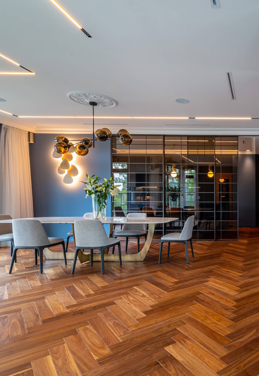 Słownikiem tej estetyki jest paleta materiałów: ciemne drewno typu orzech włoski, marmury o wyrazistej teksturze Calacatta lub Breccia, wykończenia matowe zamiast błyszczących. Meble odchodzą od surowej geometrii ku obłym, organicznym kształtom, które łagodzą światło padające z panoramicznych przeszkleń i w dotyku zbliżają wnętrze do rzeźby użytkowej. Dyskretny rejestr pracuje całą powierzchnią – podłogą, ścianą, oświetleniem – z dbałością o każdy detal, i zastępuje dotychczasowy kod ostentacyjnego przepychu.