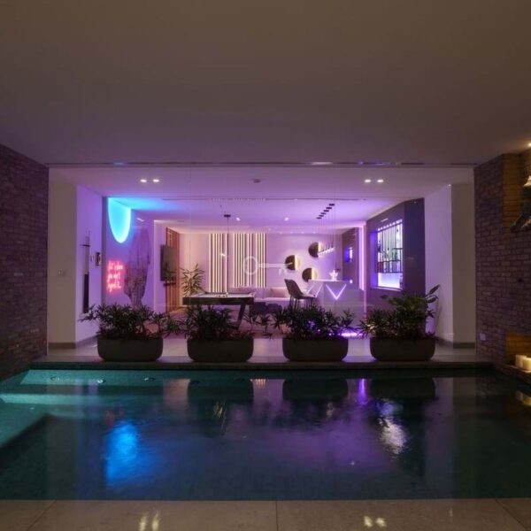 A semi-detached villa in the urbanisation, four bedrooms, four bathrooms, arranged with intent rather than habit: basement level below, an entrance floor with three en-suite bedrooms and a calm water feature setting the tone, a first floor dedicated entirely to open-plan living with terrace and private pool, and a second floor reserved for a full-width…